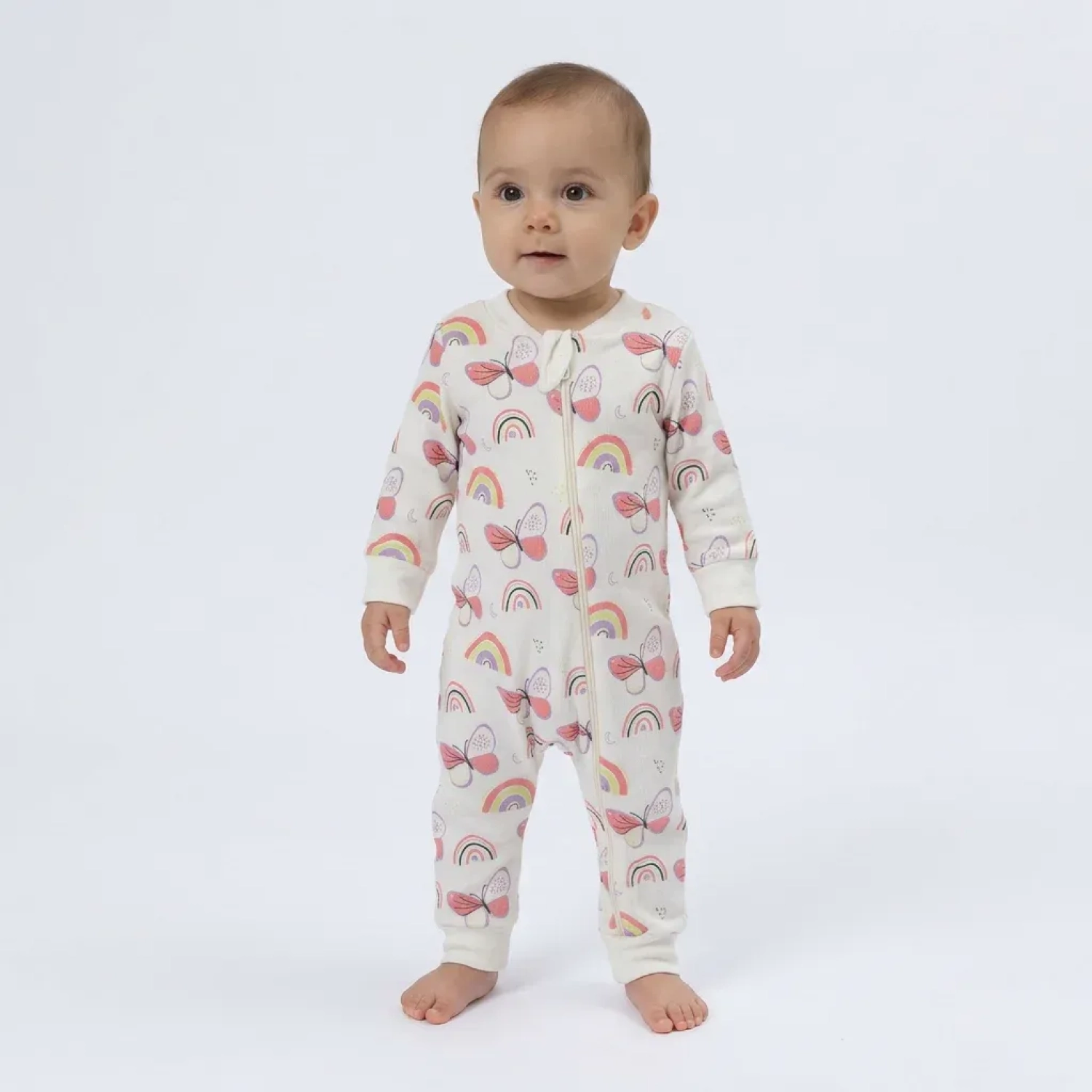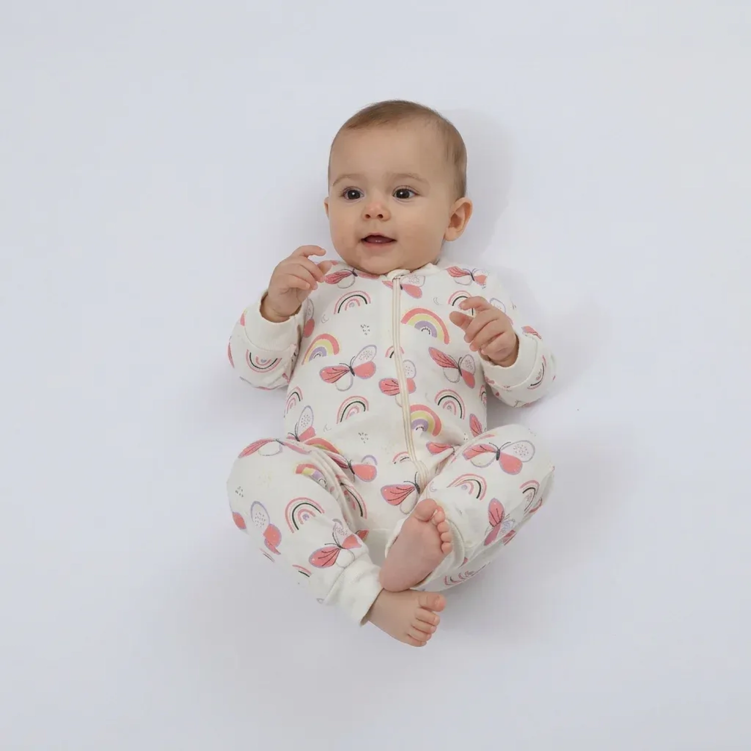 امنحي طفلك راحة لطيفة وقابلية عالية للتنفس مع هذا الرومبر المزين بطبعة الفراشة، والمصنوع من فليس سويدين قطني 100% ليمنح نعومة فائقة وتهوية طبيعية. القماش خفيف ولطيف على بشرة الطفل الحساسة، مما يوفر راحة طوال اليوم أثناء اللعب أو القيلولة أو الخروج.