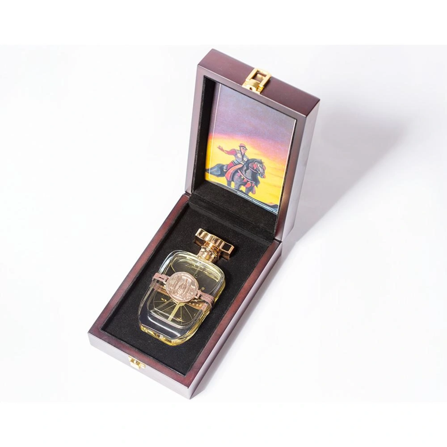الزجاجة معبأة في صندوق خشبي مصنوع يدويًا من أنواع الخشب القيمة