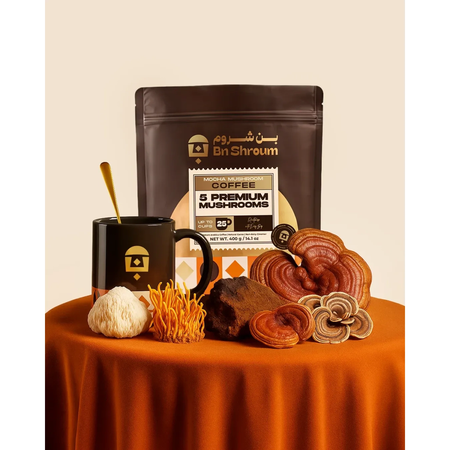 ما يميز قهوتنا عن غيرها هو احتواؤها على خمسة أنواع من الفطر الوظيفي: