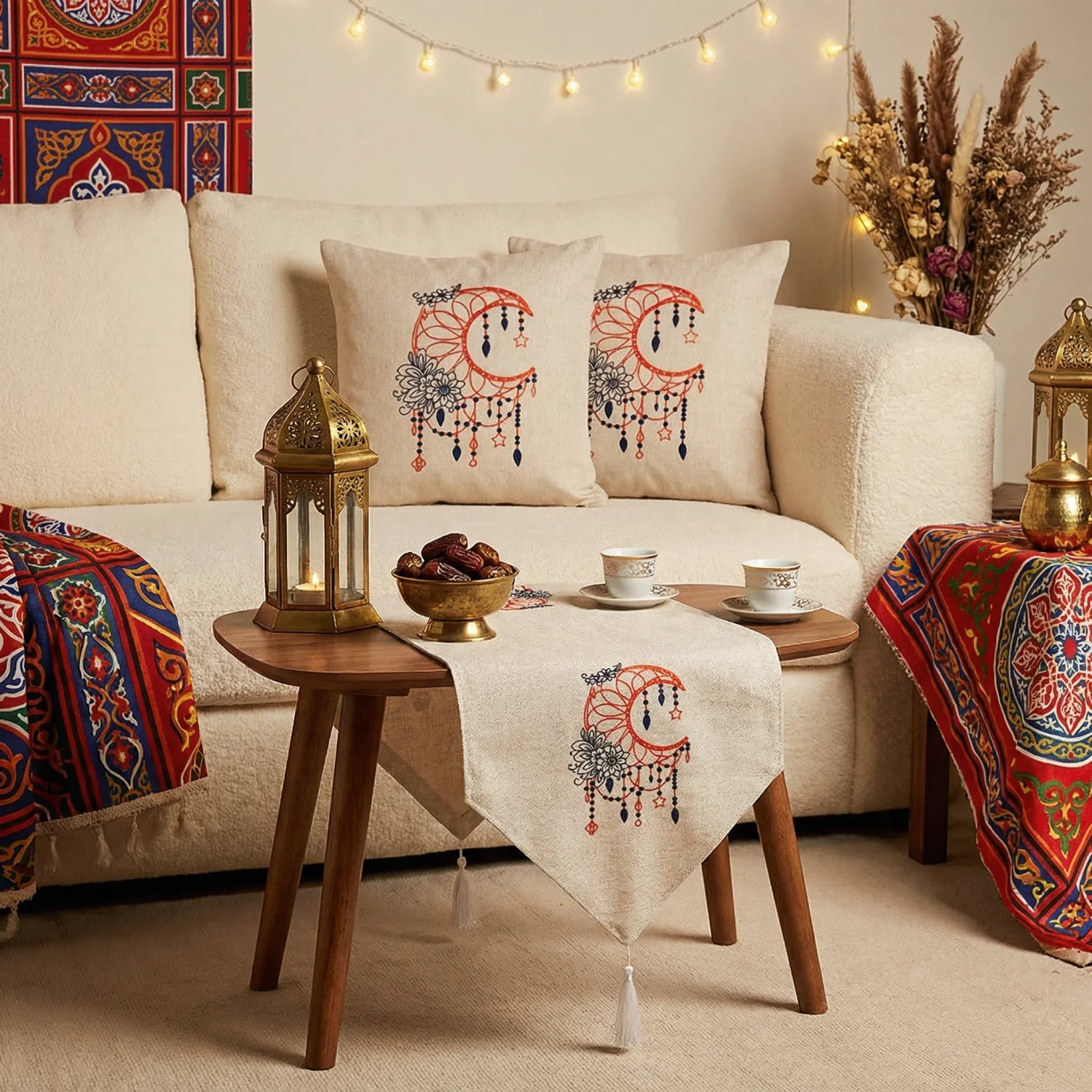 يتضمن هذا الطقم من المنسوجات الديكورية مفرش طاولة مطرزاً وغطاءين متطابقين للوسائد. صُنعت القطع من قماش بيج، وتتميز بزخارف هلال حمراء لافتة مع زينة متدلية باللونين الأسود والأحمر وتفاصيل زهور دقيقة. يمزج التصميم بين الفن الاحتفالي والرمزية الثقافية، مما يجعله مثالياً لديكور رمضان والعيد. يُعد الطقم مثالياً لموائد الطعام ومناطق الجلوس، حيث يضيف الأناقة والدفء والروح الاحتفالية إلى منزلك.