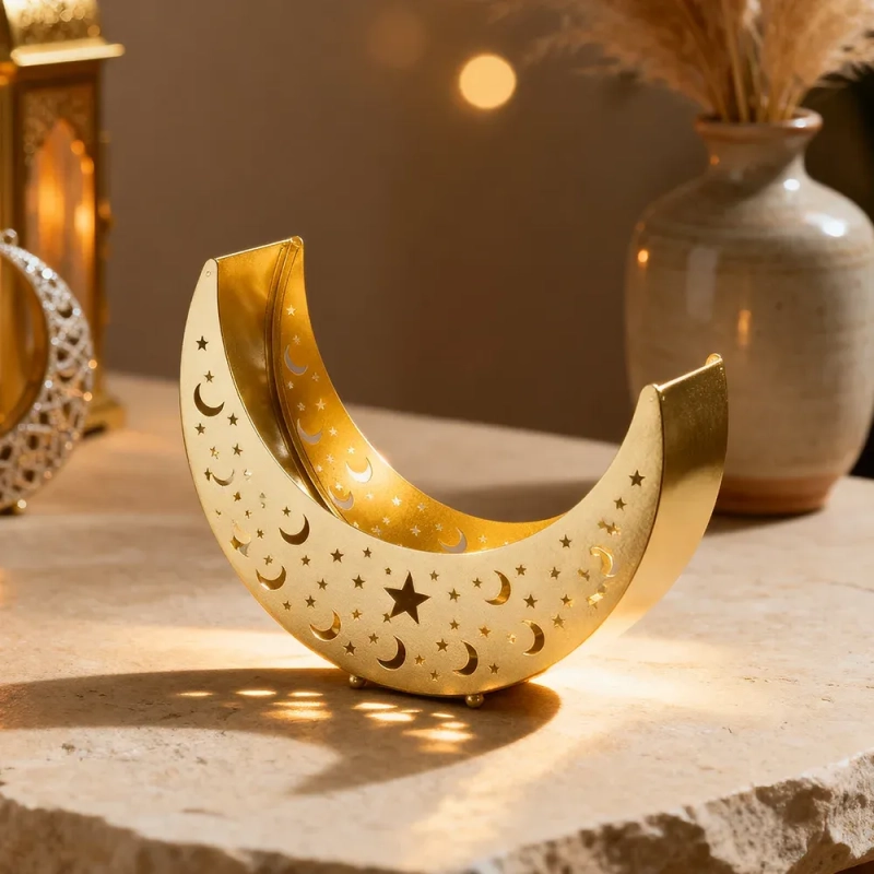 صُنعت هذه القطعة الديكورية البراقة على شكل هلال باللون الذهبي، وهي مزينة بزخارف تشبه الأحجار الكريمة، ونقوش مفرغة للنجوم، وأهلة صغيرة متدلية. بعيداً عن جمالها، تتميز بوجود حجرة تخزين مخفية، مما يجعلها مثالية كقطعة مركزية احتفالية أو لتخزين الأشياء الصغيرة. يضيف تصميمها الأنيق لمسة من الرقي والسحر على منزلك خلال احتفالات رمضان وعيد الفطر.