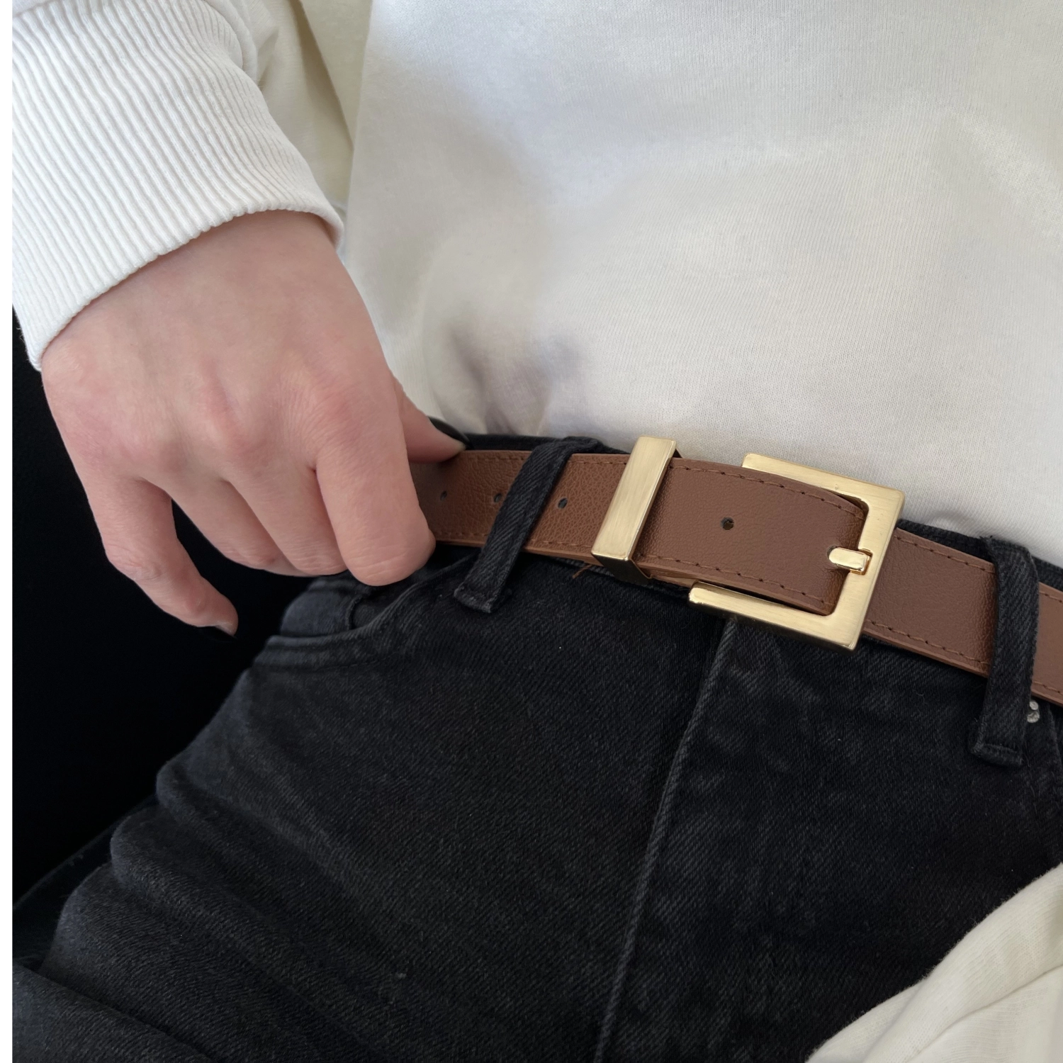 حزام نسائي من الجلد الصناعي بإبزيم مربع طول المنتج: 105 سم عرض المنتج: 3 سم