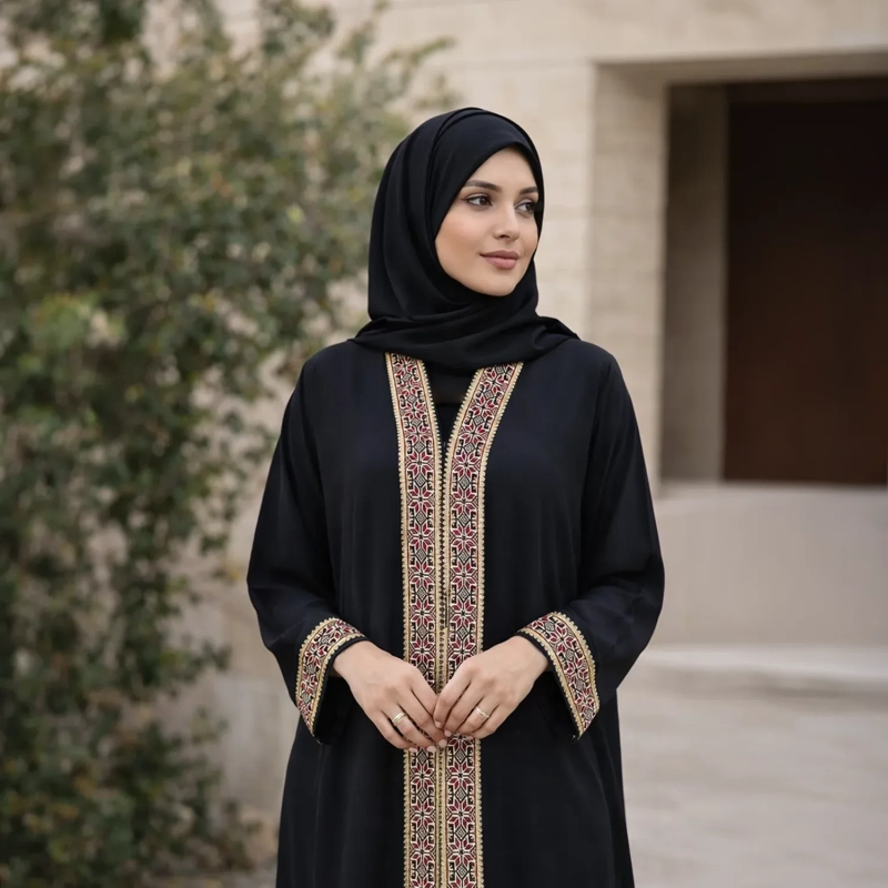 هذه العباية المغلقة خيارٌ رائعٌ لأمسيات رمضان، واحتفالات العيد، والمناسبات الثقافية الرسمية، فهي تمزج بين التراث التقليدي والتصميم العصري الأنيق. يضفي لونها الأسود الداكن لمسةً من الفخامة، بينما تُضفي التطريزات الهندسية الدقيقة المستوحاة من فن التطريز، باللونين الأحمر والذهبي الغنيين على الجزء الأمامي وأساور الأكمام، لمسةً ثقافيةً راقية. صُنعت العباية من قماش الندى أو الكريب الفاخر، وتتميز بخفة وزنها، وتهويتها الجيدة، ومقاومتها للتجاعيد، مما يمنحها انسيابيةً أنيقةً دون عناء. تتميز العباية بزر واحد في الجزء العلوي الأمامي لمزيد من الاحتشام وسهولة الارتداء، وتأتي مع شلّة سوداء متناسقة بنفس تصميم بطانة العباية، لتُشكّل طقمًا متكاملًا وأنيقًا.