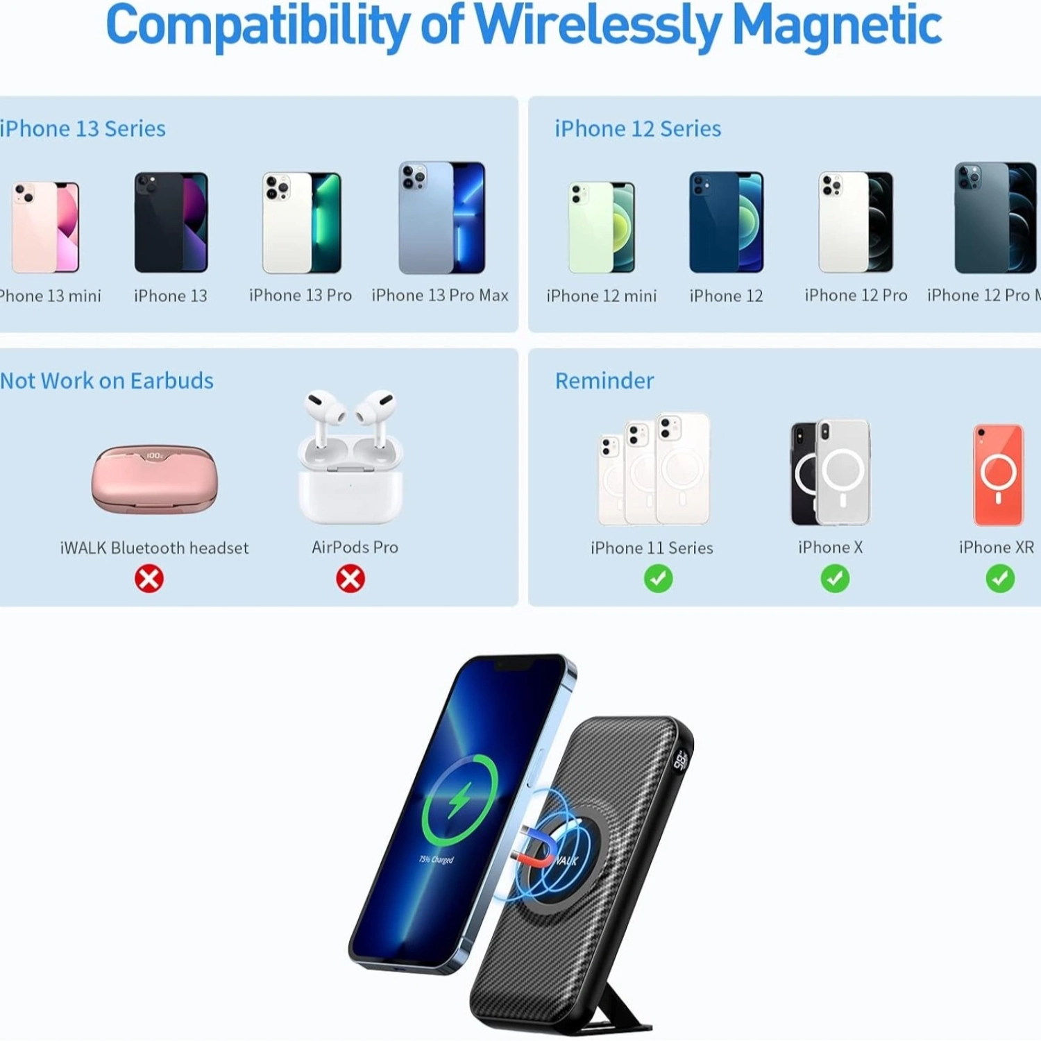 شاحن باور بانك مغناطيسي لاسلكي محمول من آي ووك، سعة 20000 مللي أمبير في الساعة مع شحن لاسلكي 7.5 وات وحزمة بطارية توصيل طاقة USB C بقدرة 20 وات، ومصباح LED ذكي ومسند