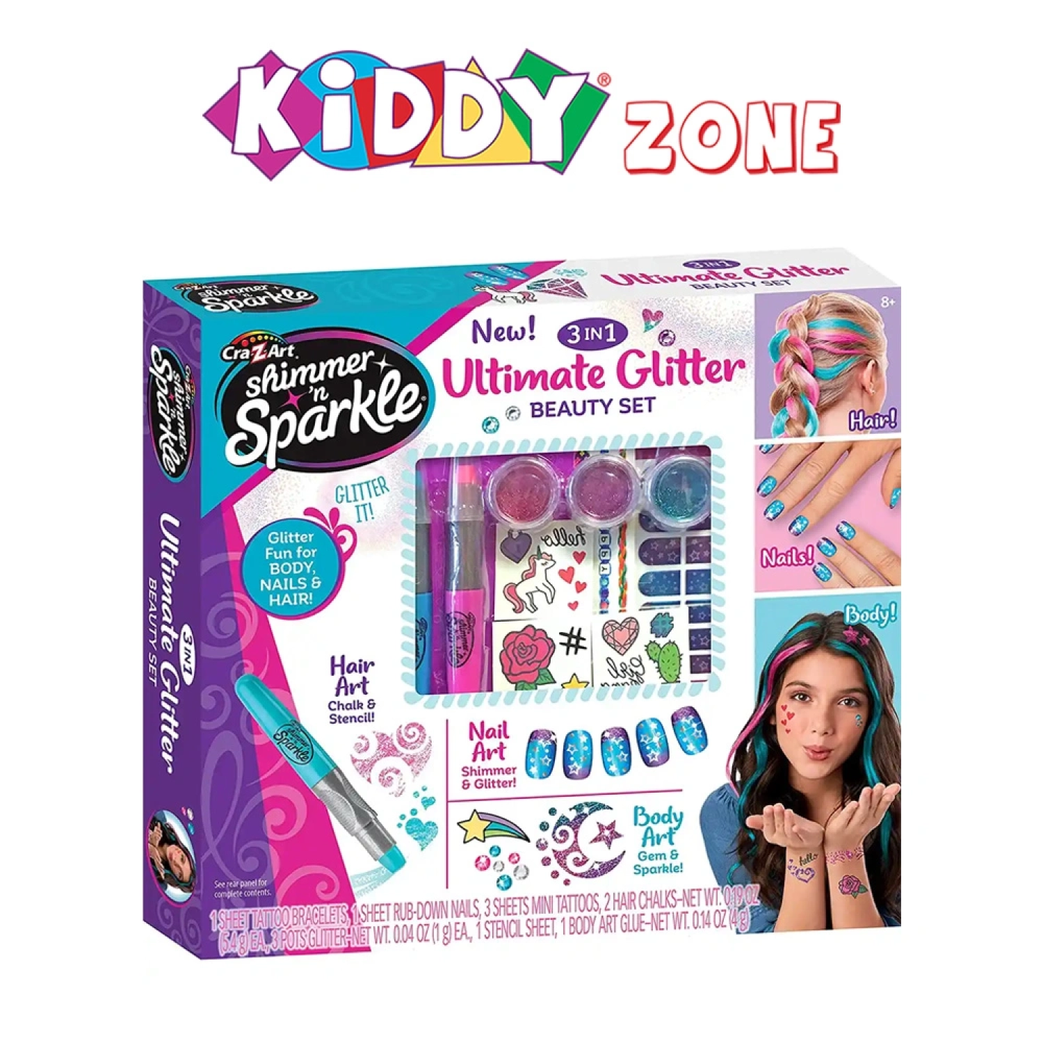 أطلقي بريقك الداخلي مع مجموعة التجميل اللامعة النهائية من شيمر آند سباركل 3 في 1! تحتوي المجموعة على مستحضرات تجميل لامعة، وإكسسوارات أظافر، وزينة شعر لتصميم إطلالات رائعة ومبهرة. مثالية للحفلات أو اللعب اليومي، آمنة وسهلة الاستخدام للأطفال الذين يحبون الجمال والإبداع.