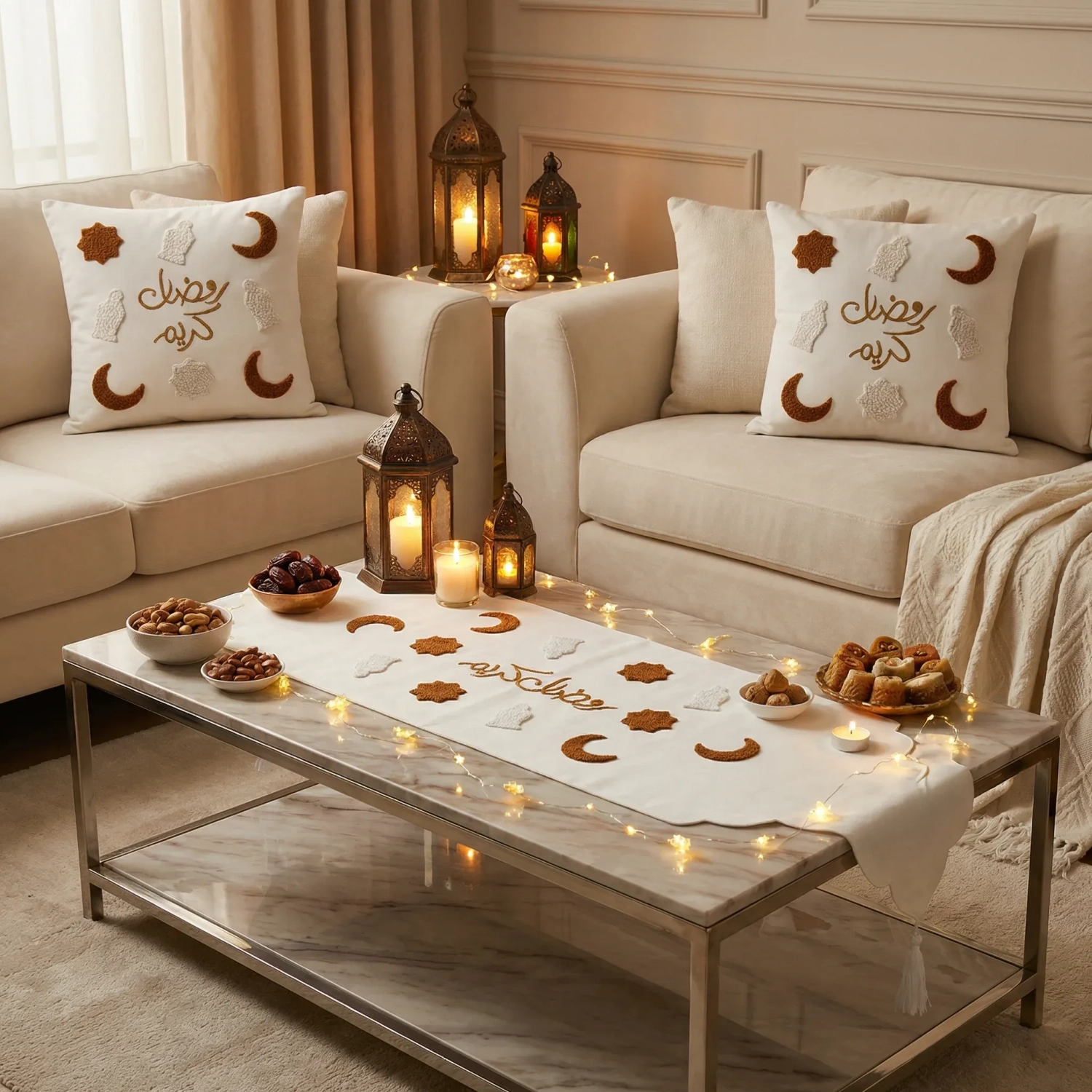 طقم منسوجات رمضان بنقوش الفانوس والهلال – مزيج متناغم بين الرموز التقليدية وفن الأقمشة الراقي.