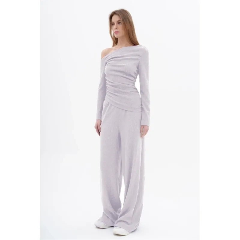 بنطلون باللون الرمادي بحزام مرن عند الخصر مع بلوزة بكتف مكشوف من "البوليستر - 66%، فيسكوز - 32%، إيلاسران - 2%"