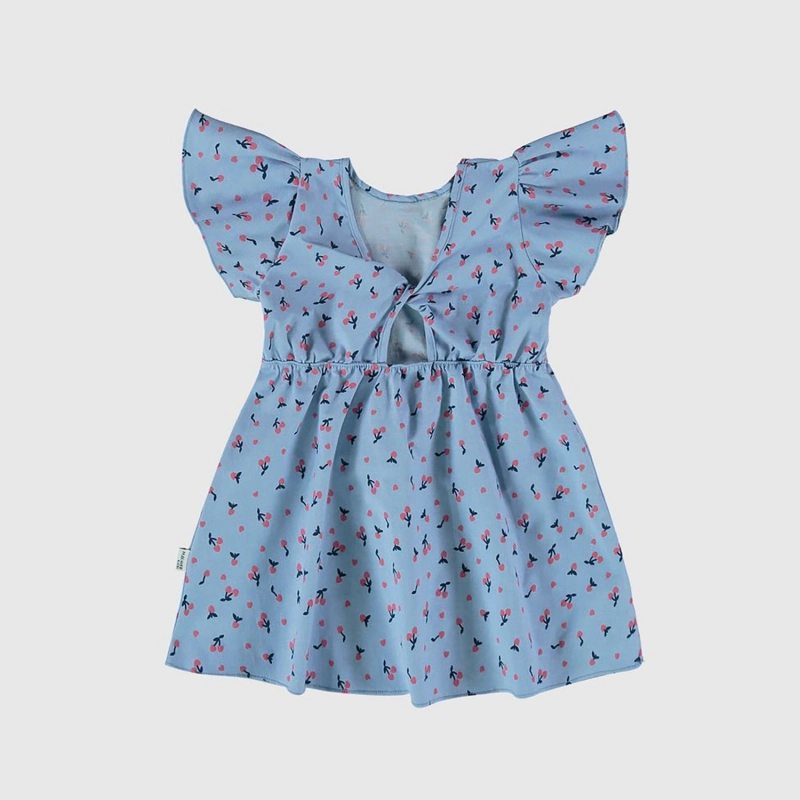 فستان أطفال جذاب مصنوع من قماش شامبراي قطني ناعم، يتميز بياقة دائرية وأكمام قصيرة وفتحة خلفية. طبعة الكرز المرحة تضفي لمسة من الراحة اليومية.