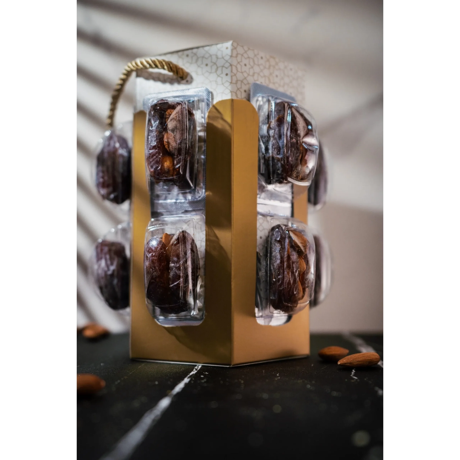تمر مجدول كبير الحجم محشو بالوز بطعم غني، مغلف بعناية في علبة أنيقة، مثالي لتقديمه كهدية راقية. (28 قطعة)