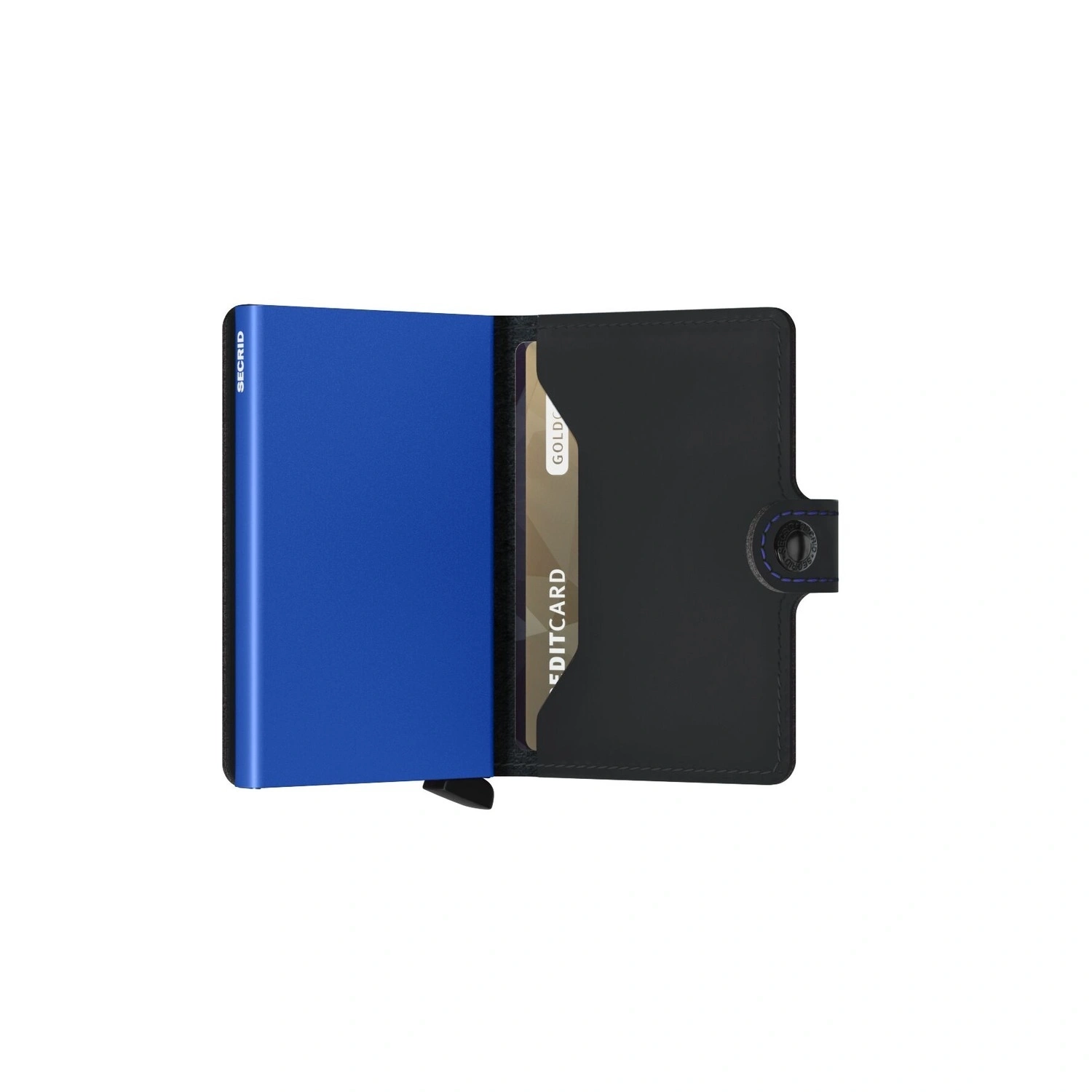 محفظة صغيرة وأنيقة مات باللونين الأسود والأزرق. مصممة بعدة فتحات للبطاقات والنقود، لتجمع بين الأناقة والعملية للاستخدام اليومي.