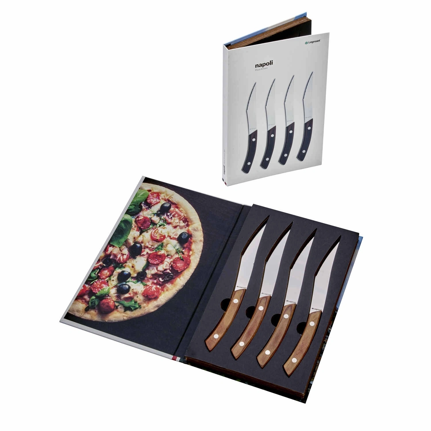 طقم نابولي يضم أربعة سكاكين بيتزا عالية الجودة مزودة بشفرات من الفولاذ المقاوم للصدأ ومقابض خشبية داكنة. مثالي لتقطيع البيتزا بسهولة مع إضافة لمسة من الأناقة لتجربة تناول الطعام.