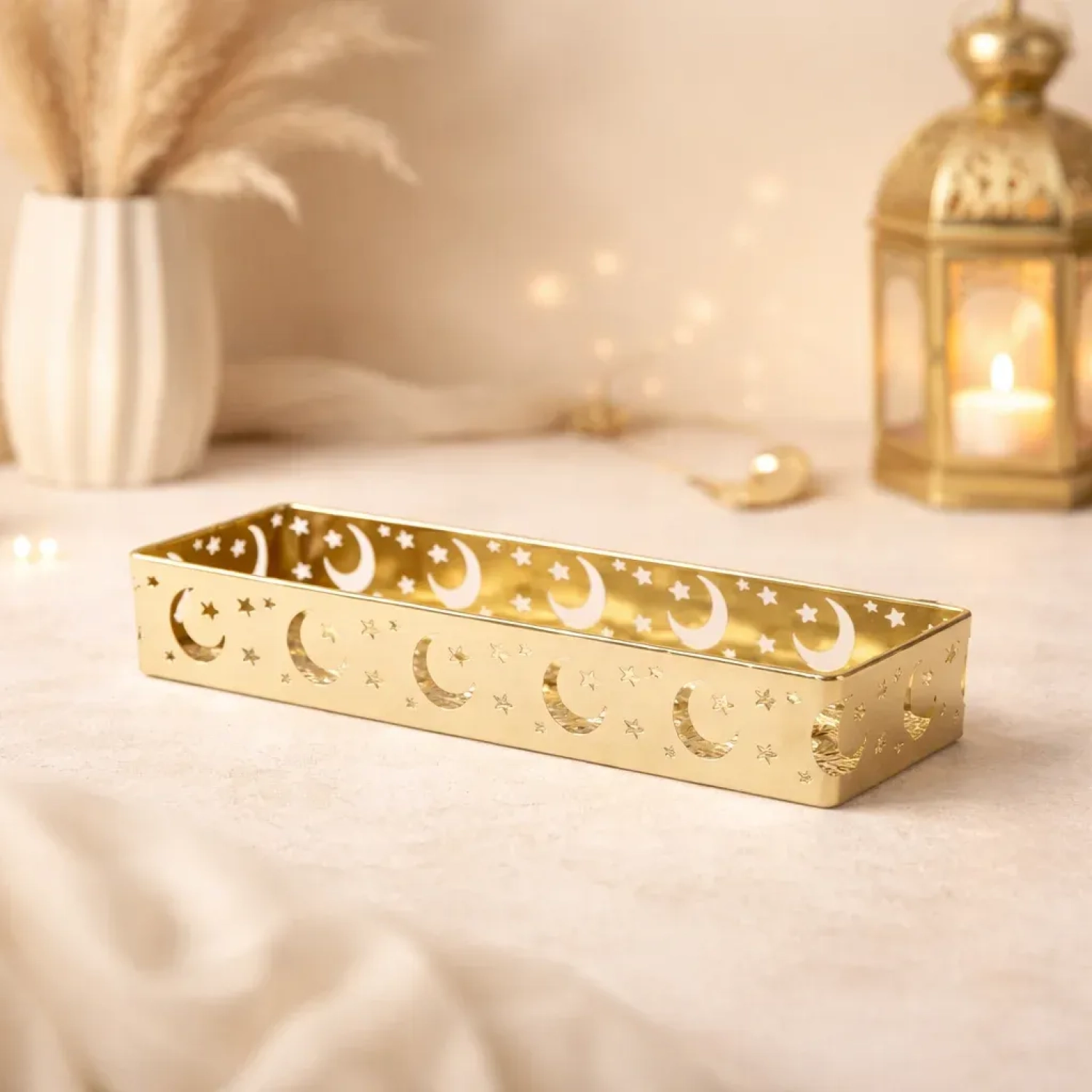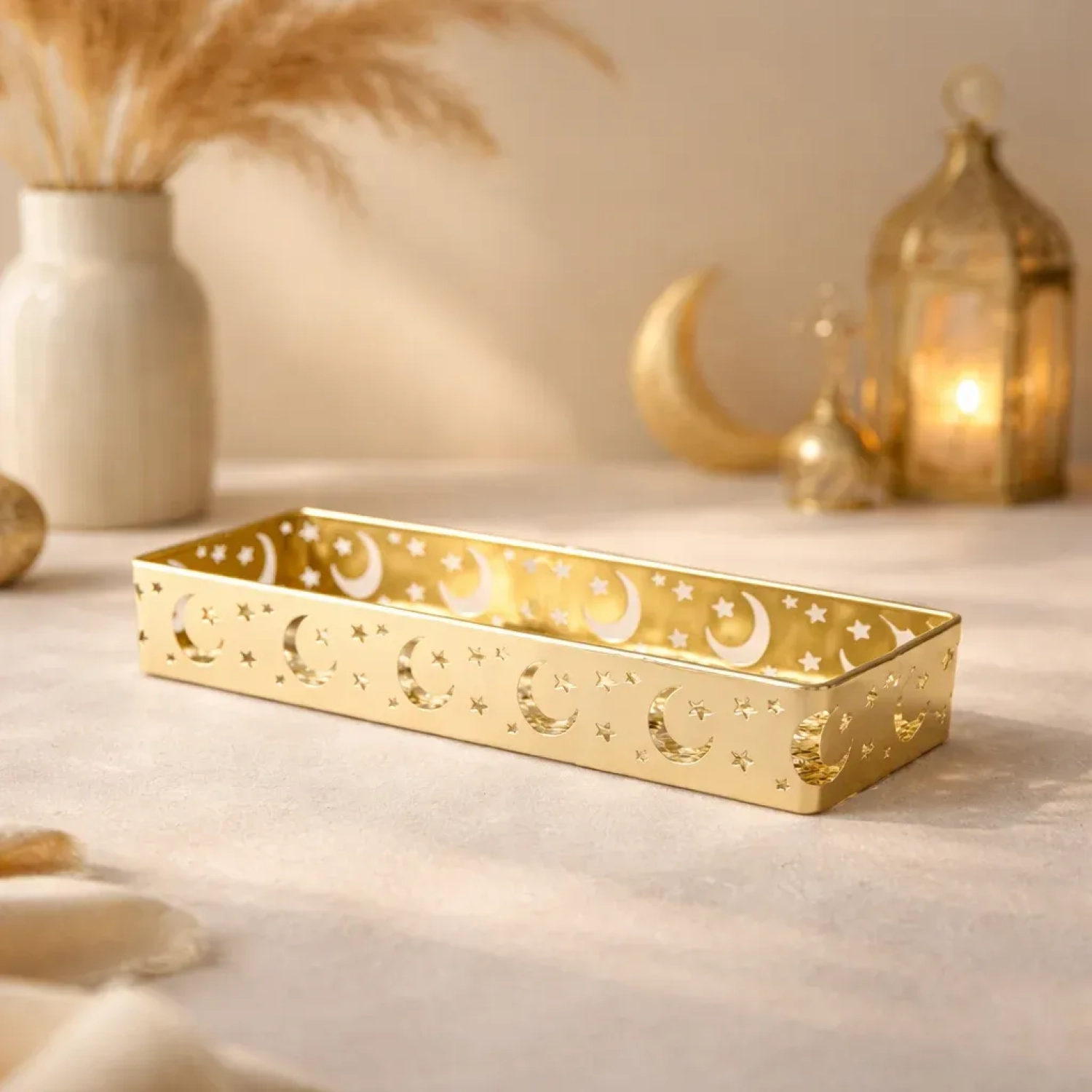 صينية رمضانية باللون الذهبي مزخرفة بهلال ونجمة
