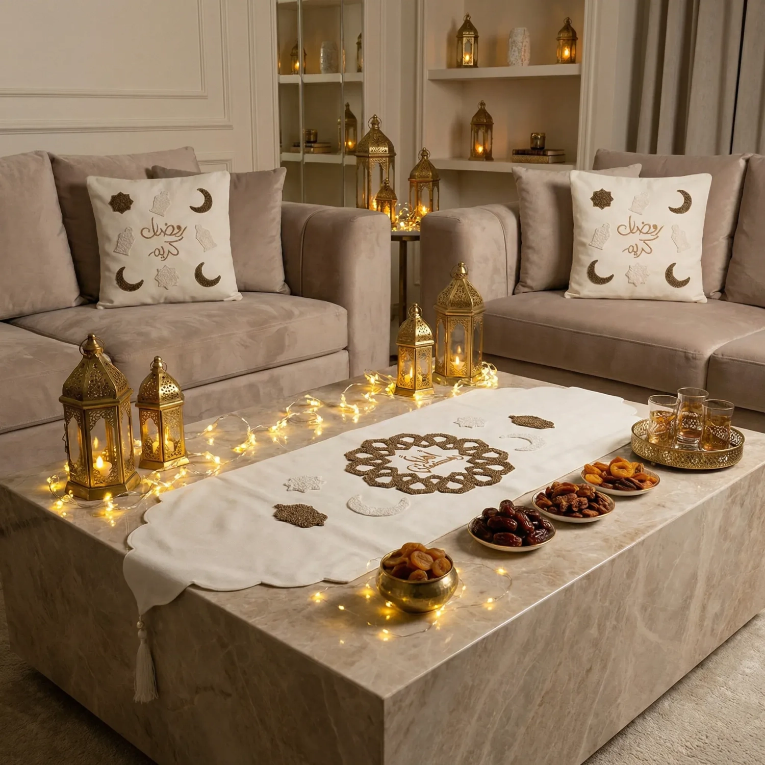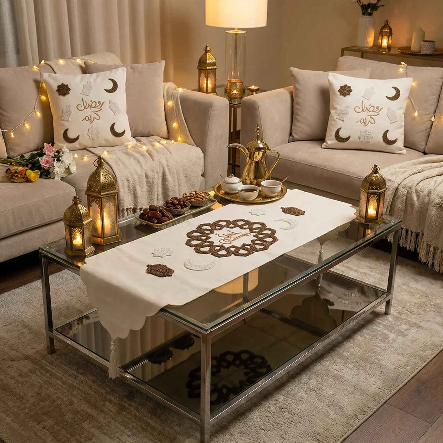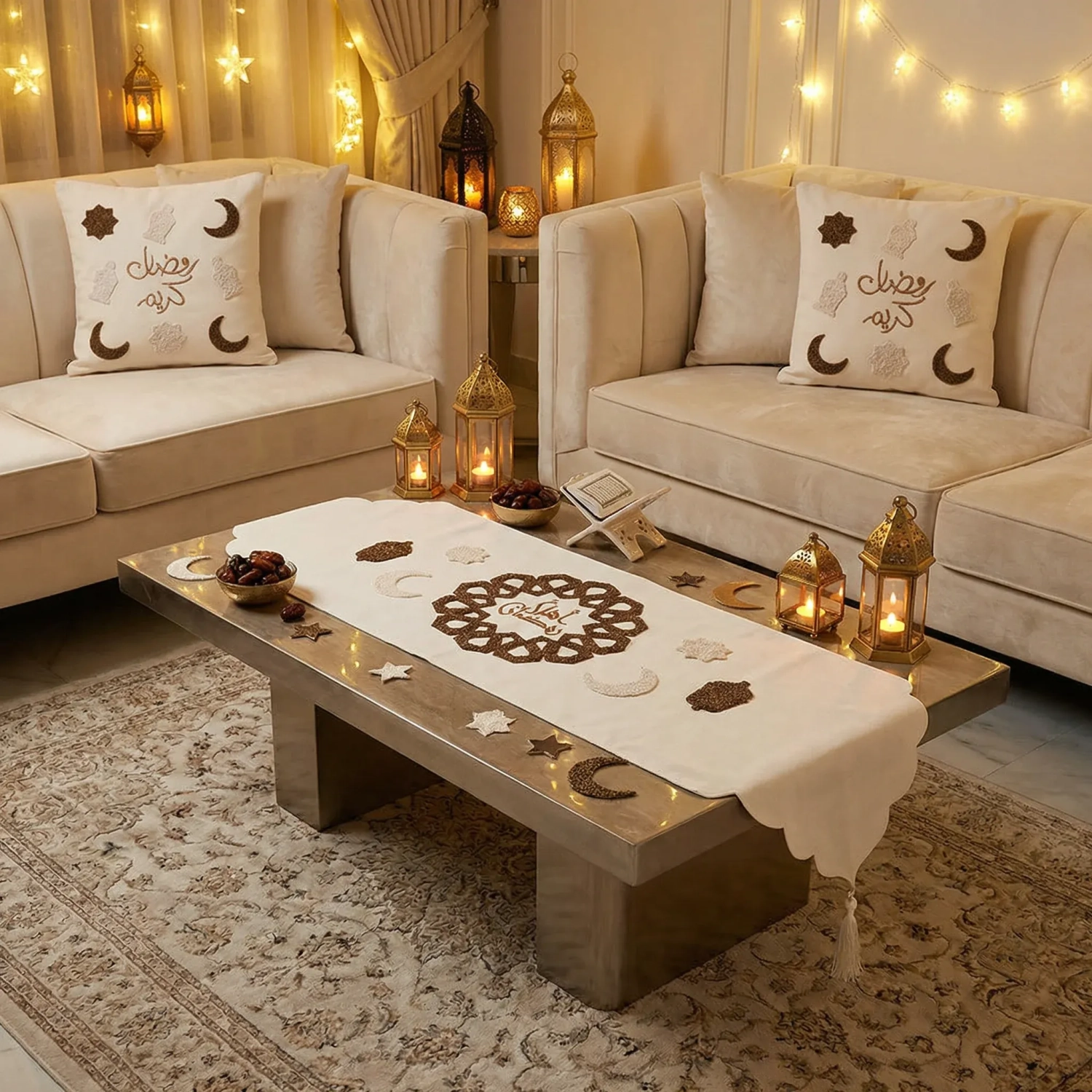 يتضمن هذا الطقم من المنسوجات الاحتفالية مفرش طاولة مطرزاً وغطاءين متطابقين للوسائد، صُنعت من قماش أنيق مع تطريز دقيق. يتميز الطقم بزخارف الأهلة، الفوانيس، والخط العربي بعبارات "رمضان كريم" و"أهلاً رمضان"، مما يعزز جمال ديكور منزلك خلال الشهر الفضيل. مثالي لخلق أجواء دافئة وترحيبية، حيث يجمع بين الرمزية الثقافية والحرفية الراقية.