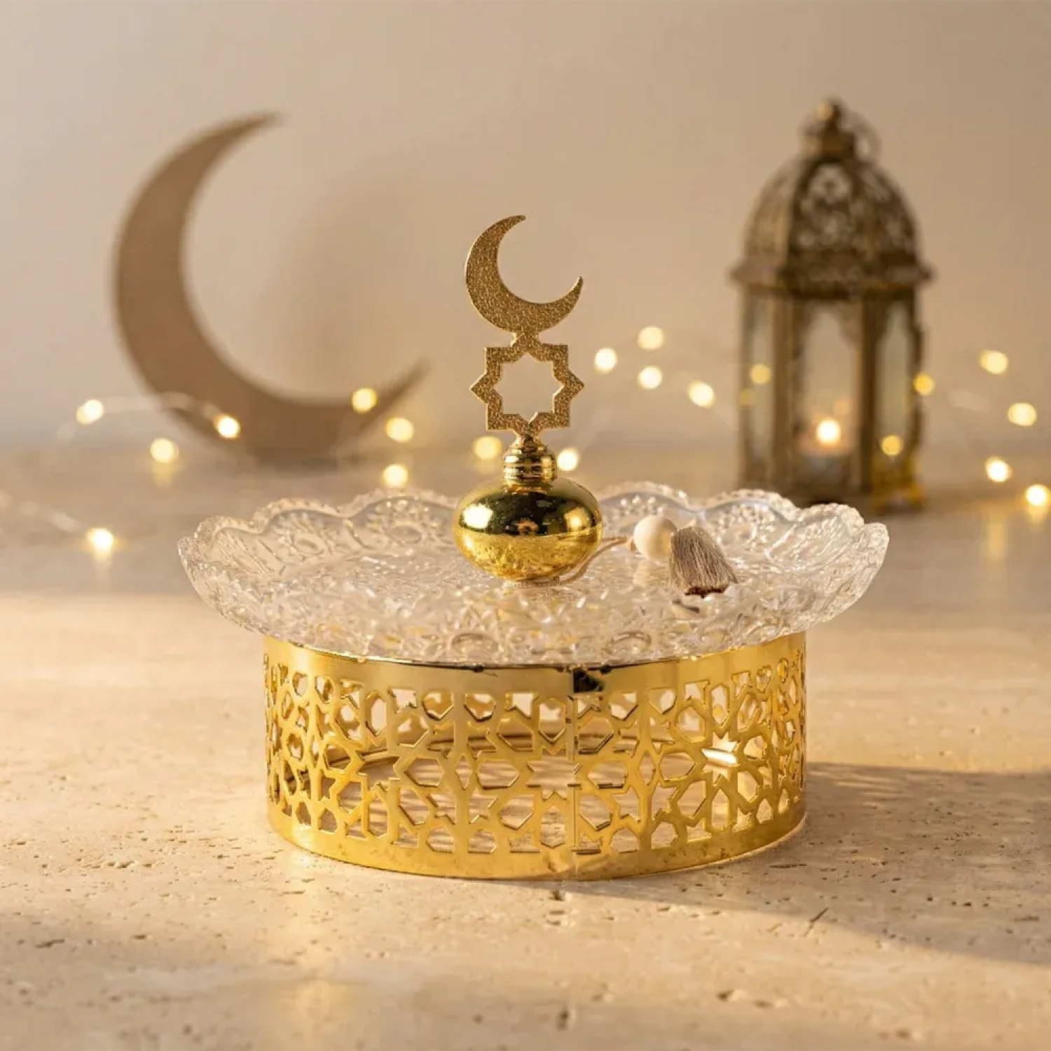 قدم لضيوفك أشهى المأكولات بأسلوب عصري مع هذه الصينية الذهبية المستديرة، المصممة بأنماط مفرغة معقدة تعكس روح شهر رمضان المبارك. مثالية لتقديم التمر، الحلويات، أو المقبلات الصغيرة، فهي تجمع بين الأناقة والعملية. تُعد هذه الصينية خياراً مثالياً لموائد الإفطار، السحور، أو التجمعات الاحتفالية، حيث تضفي لمسة دافئة وترحيبية على مائدتك.