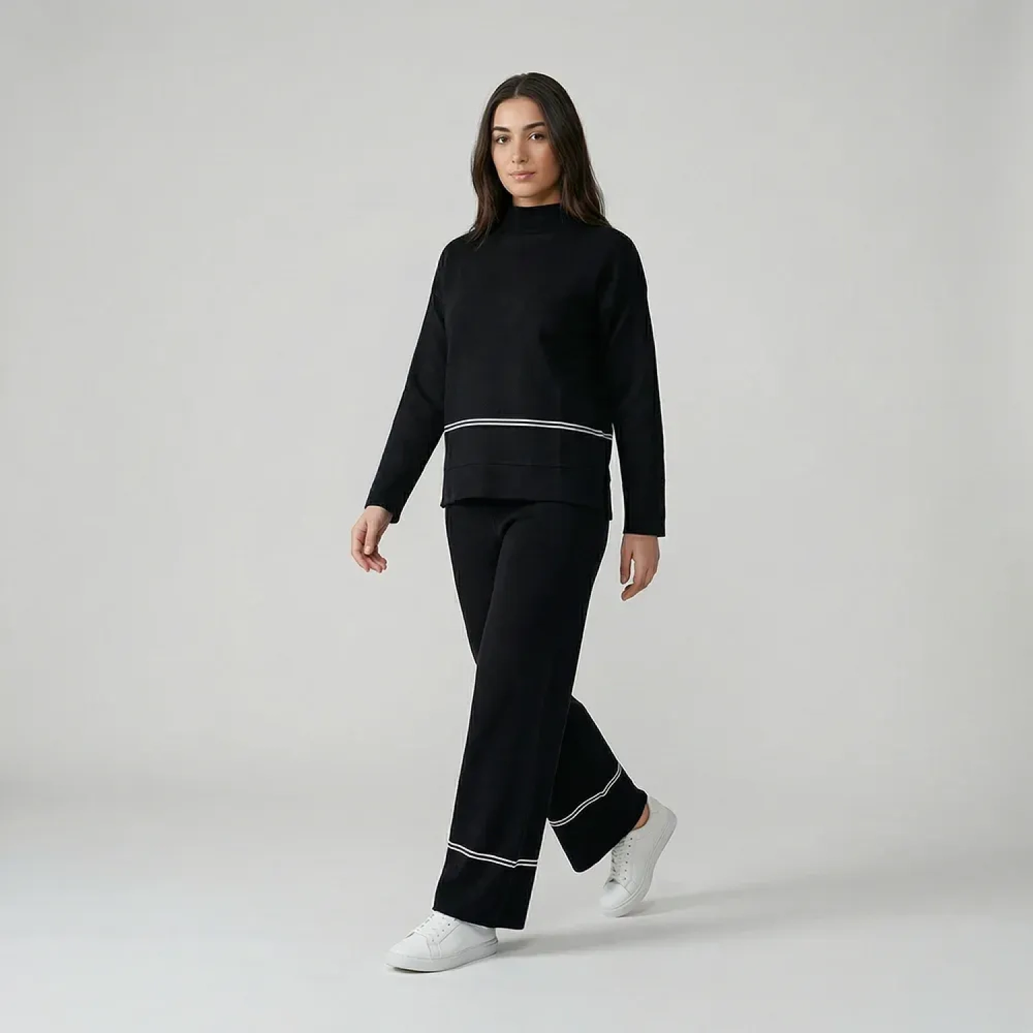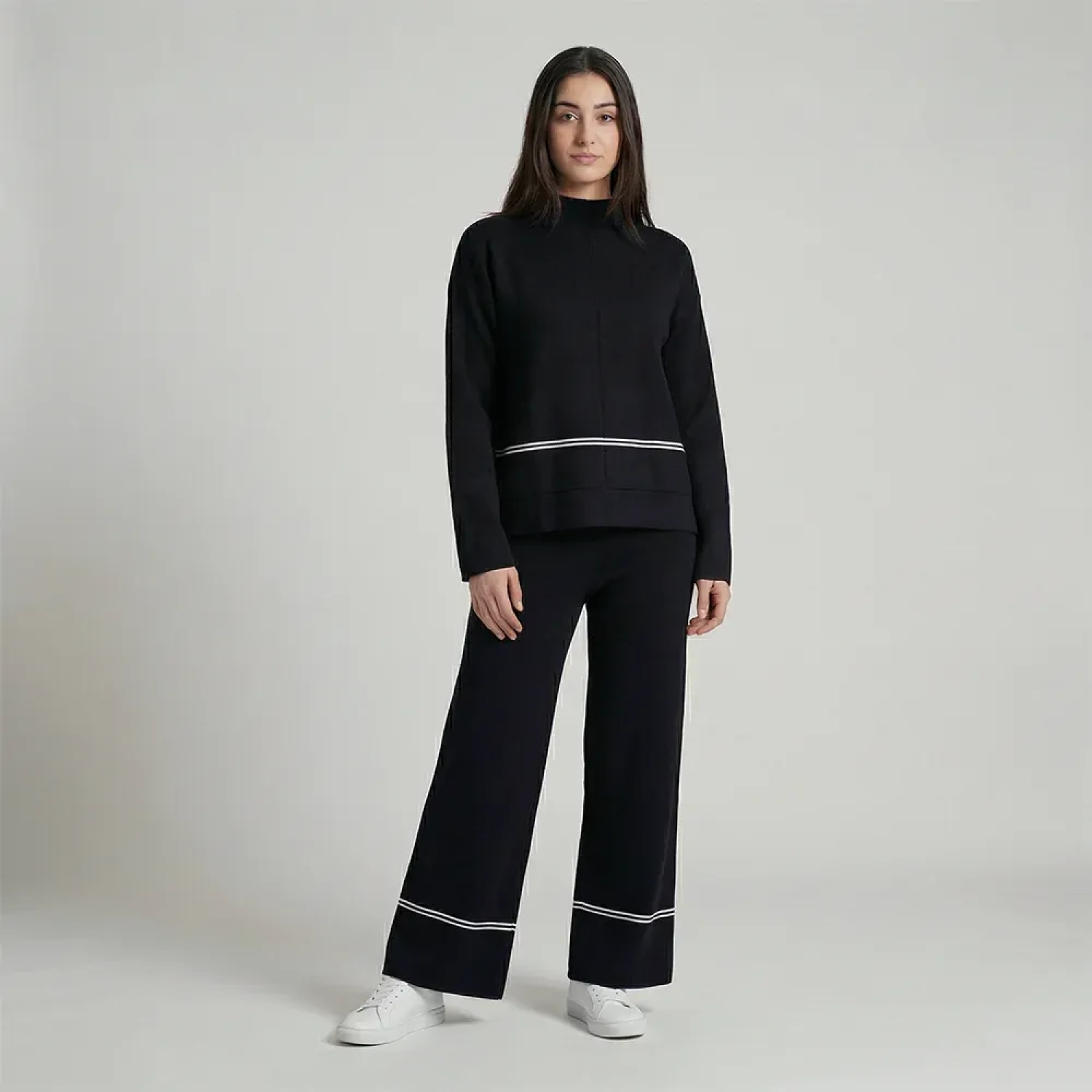 طقم نسائي عصري من التريكو بياقة عالية وقماش ناعم وقصة مريحة