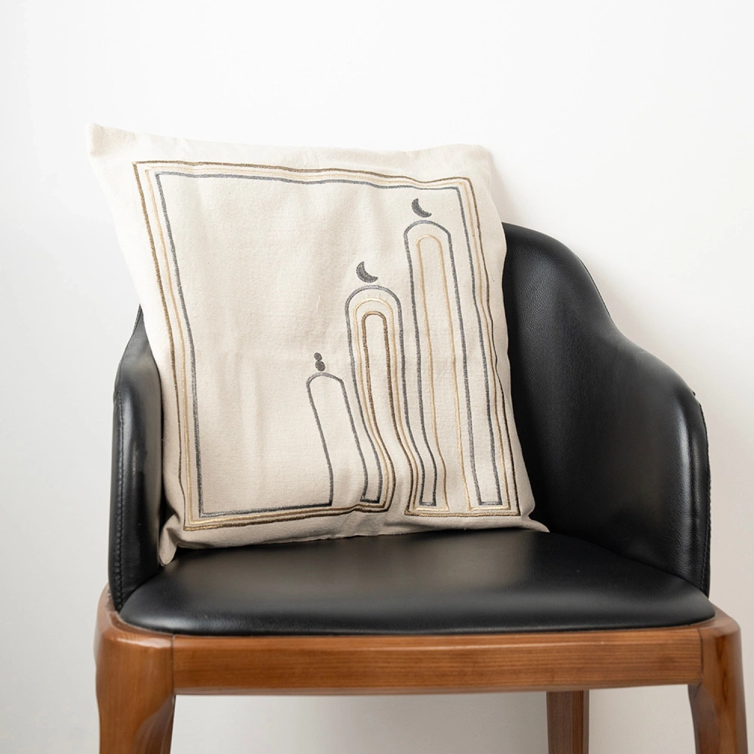 وسادة بتصميم عصري يعكس جمالية العمارة الإسلامية من خلال خطوط هندسية أنيقة تمثل المآذن والهلال، بإطار بسيط يضفي لمسة راقية ومميزة لديكور منزلك. تصميم مثالي لمحبي البساطة والفخامة في آنٍ واحد.