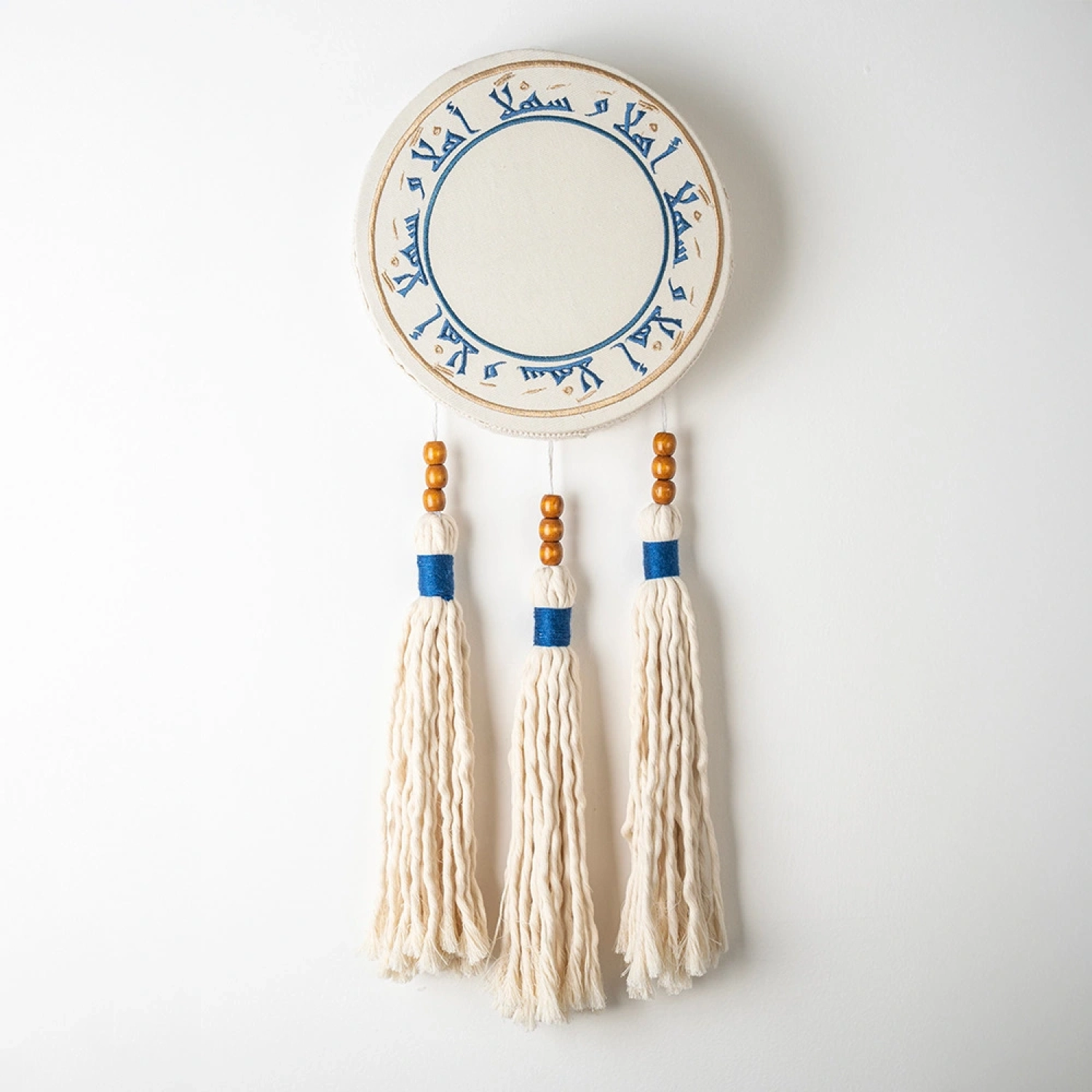 تعليقة جدارية أنيقة بلمسات شرقية تحمل عبارة “اهلا و سهلا ”، مصنوعة من خامات فاخرة مع تفاصيل مزخرفة مستوحاة من الفن الإسلامي. تتميز بتصميم دائري مزين بنقوش هندسية جذابة، مع شرّابات قطنية متدلية تضيف لمسة من الدفء والجمال لديكور المنزل. مثالية لاستقبال الضيوف بروح الترحيب والأصالة.