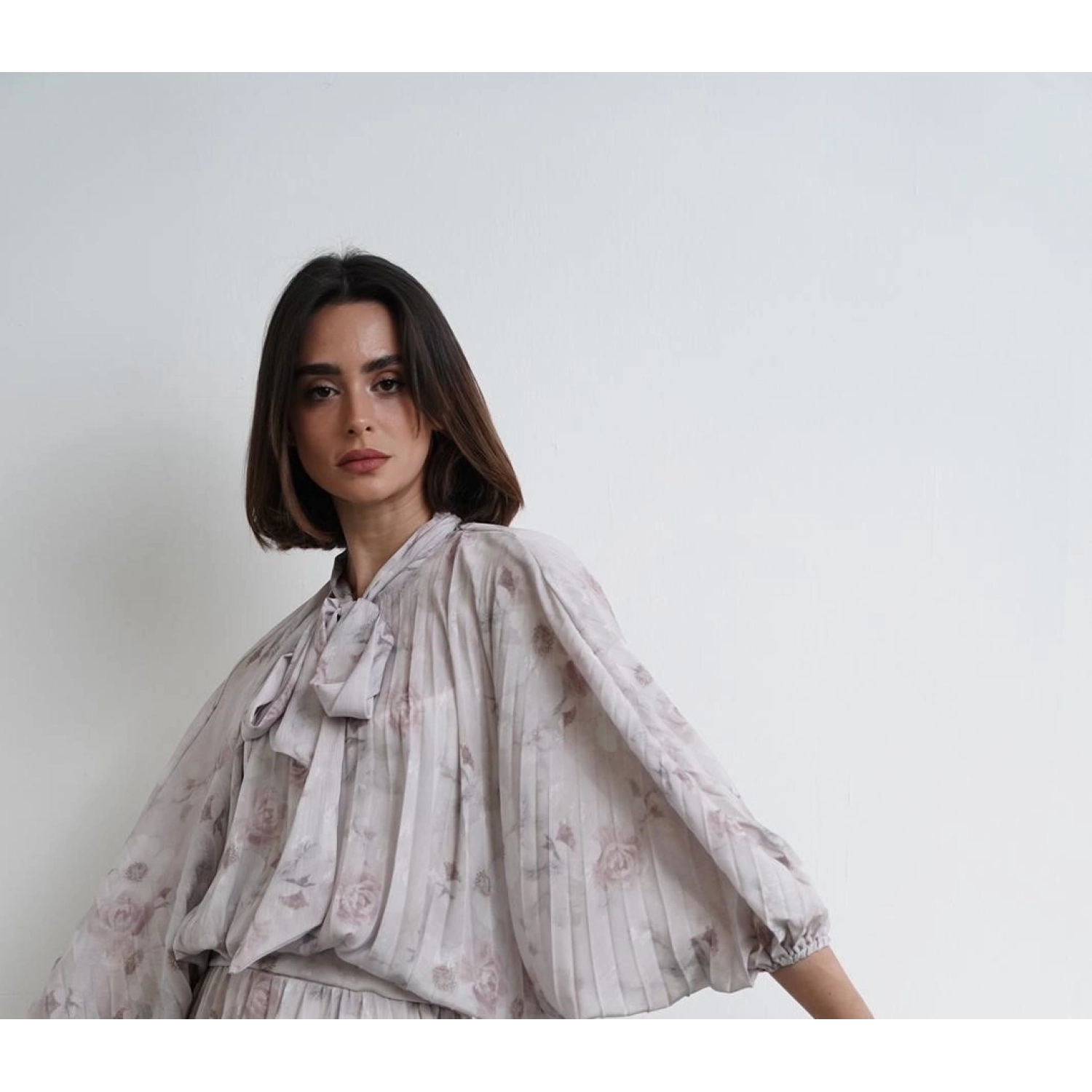 قميص بليسيه مزخرف بأزهار - رمادي