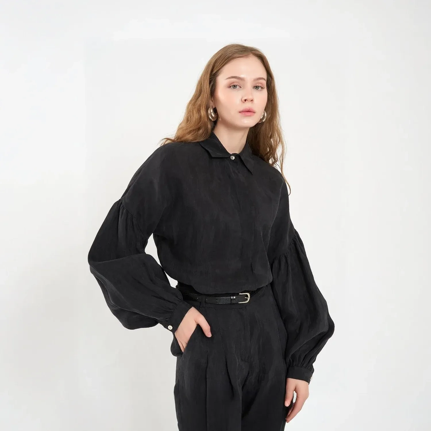 أعيدي تعريف التنسيق العصري مع هذا الطقم المذهل المكون من قطعتين بأكمام الفانوس (Lantern-Sleeve). صُمم هذا الطقم مع التركيز على الحجم والانسيابية، ويتميز بقميص راقٍ بأزرار وأكمام منحوتة وجريئة، منسق مع بنطال واسع الأرجل بانسدال مثالي. يقدم هذا الطقم مزيجاً سلسلاً بين التصميم المبتكر والأناقة التي لا تضاهى، مما يجعله خياراً مثالياً لإطلالات العمل الراقية أو المناسبات المسائية الفاخرة.