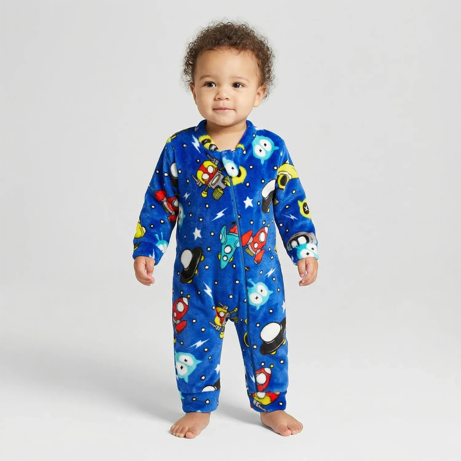 Keep your little one cozy with this Rocket Print Baby Romper, crafted from 100% cotton suedine fleece for softness, warmth, and all-day comfort. The navy blue romper is gentle on delicate skin and ideal for cooler days, providing a snug and comfortable fit while adding a playful touch with its adorable rocket print.