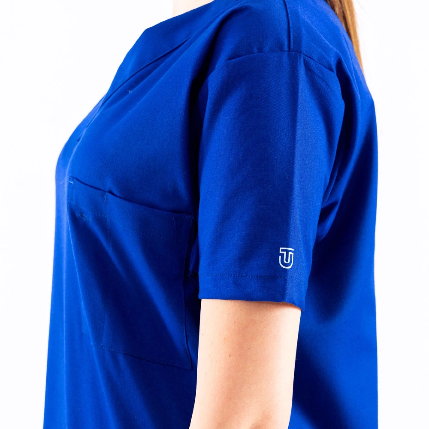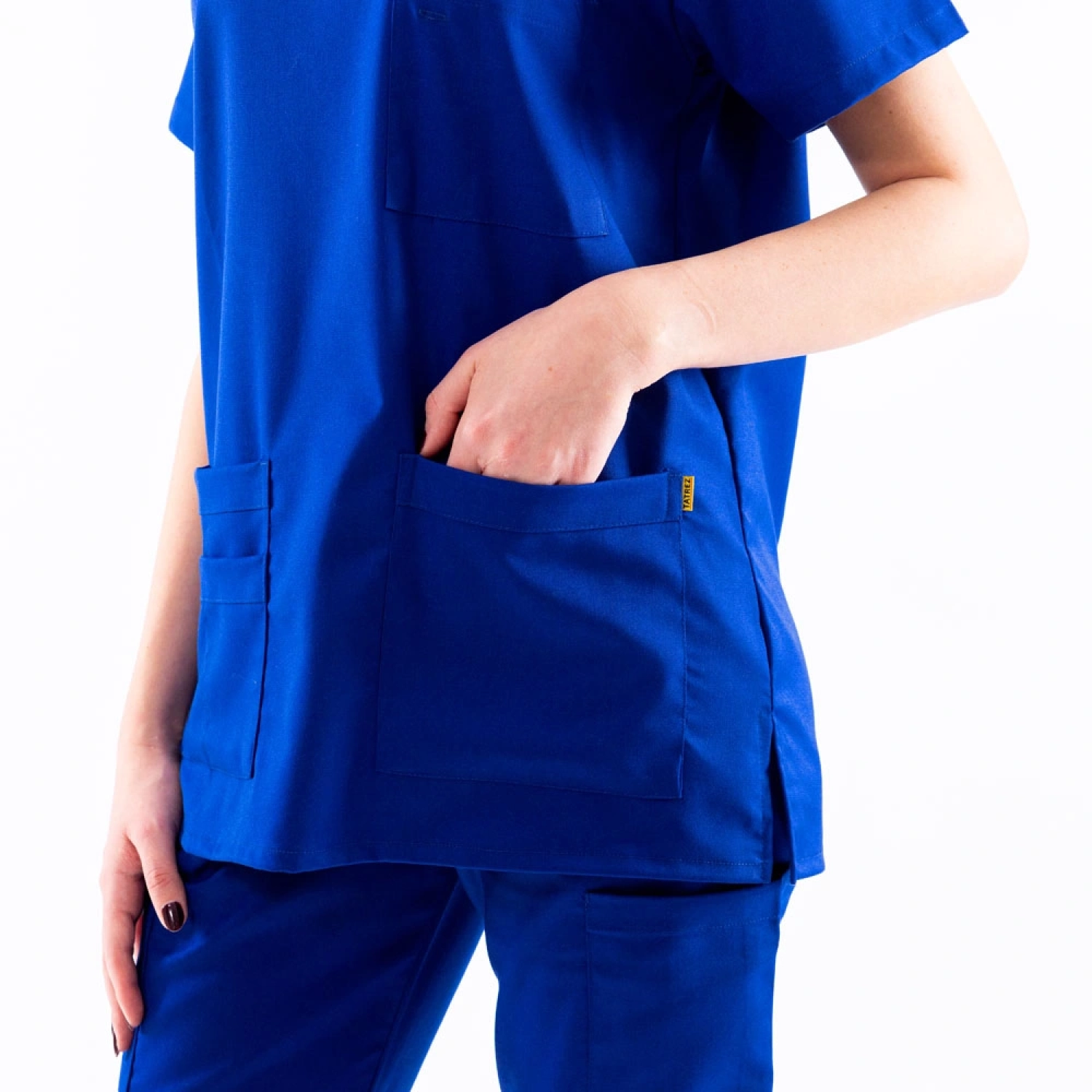 Unisex medical unifrom set in a rich blue color, made from high-quality Lycra fabric for all-day comfort and flexibility. Features a half-sleeve scrub top with a relaxed fit and functional pockets for essential tools, paired with comfortable medical pants with additional pockets for convenience. The stretchable, breathable fabric ensures optimal mobility, making it a perfect choice for healthcare professionals.