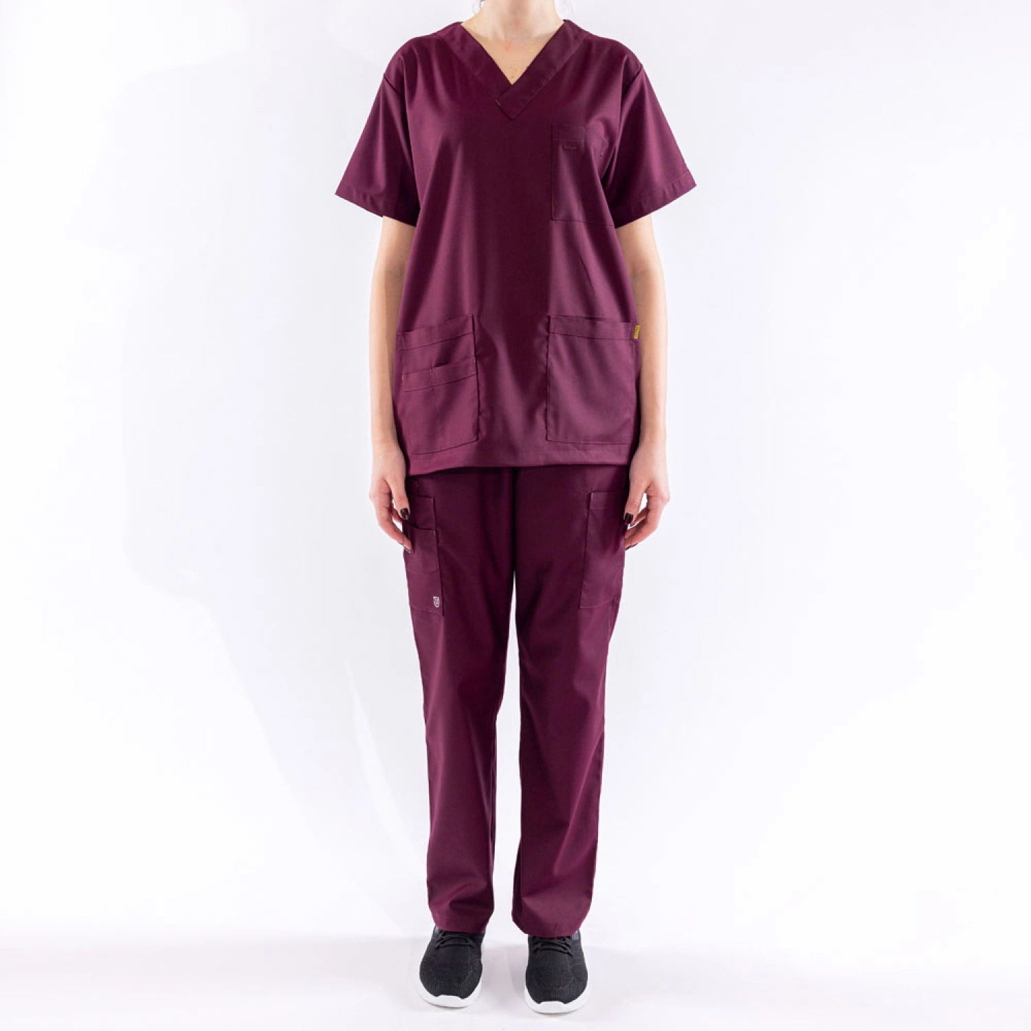 Unisex medical unifrom set in a rich burgundy color, made from high-quality Lycra fabric for all-day comfort and flexibility. Features a half-sleeve scrub top with a relaxed fit and functional pockets for essential tools, paired with comfortable medical pants with additional pockets for convenience. The stretchable, breathable fabric ensures optimal mobility, making it a perfect choice for healthcare professionals.