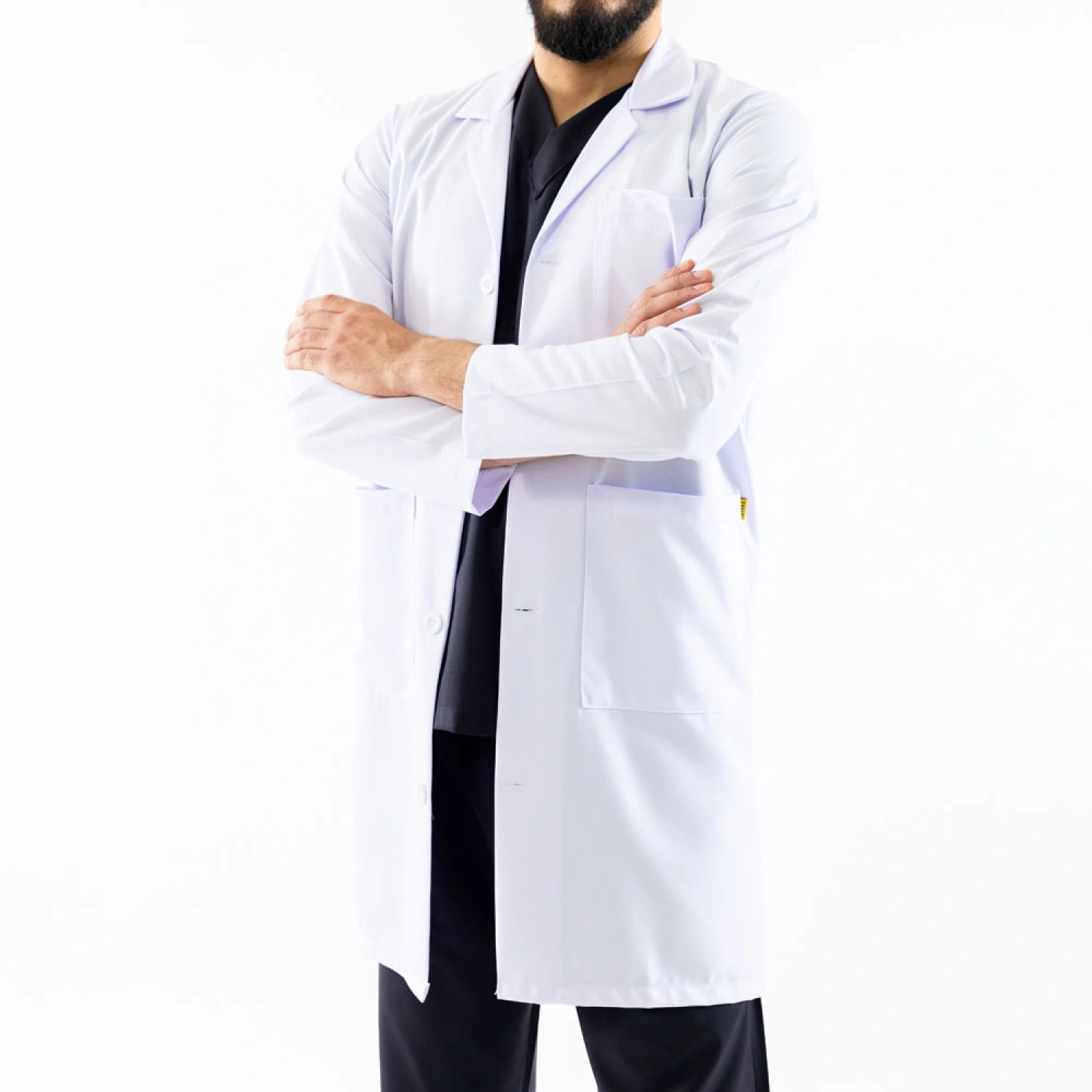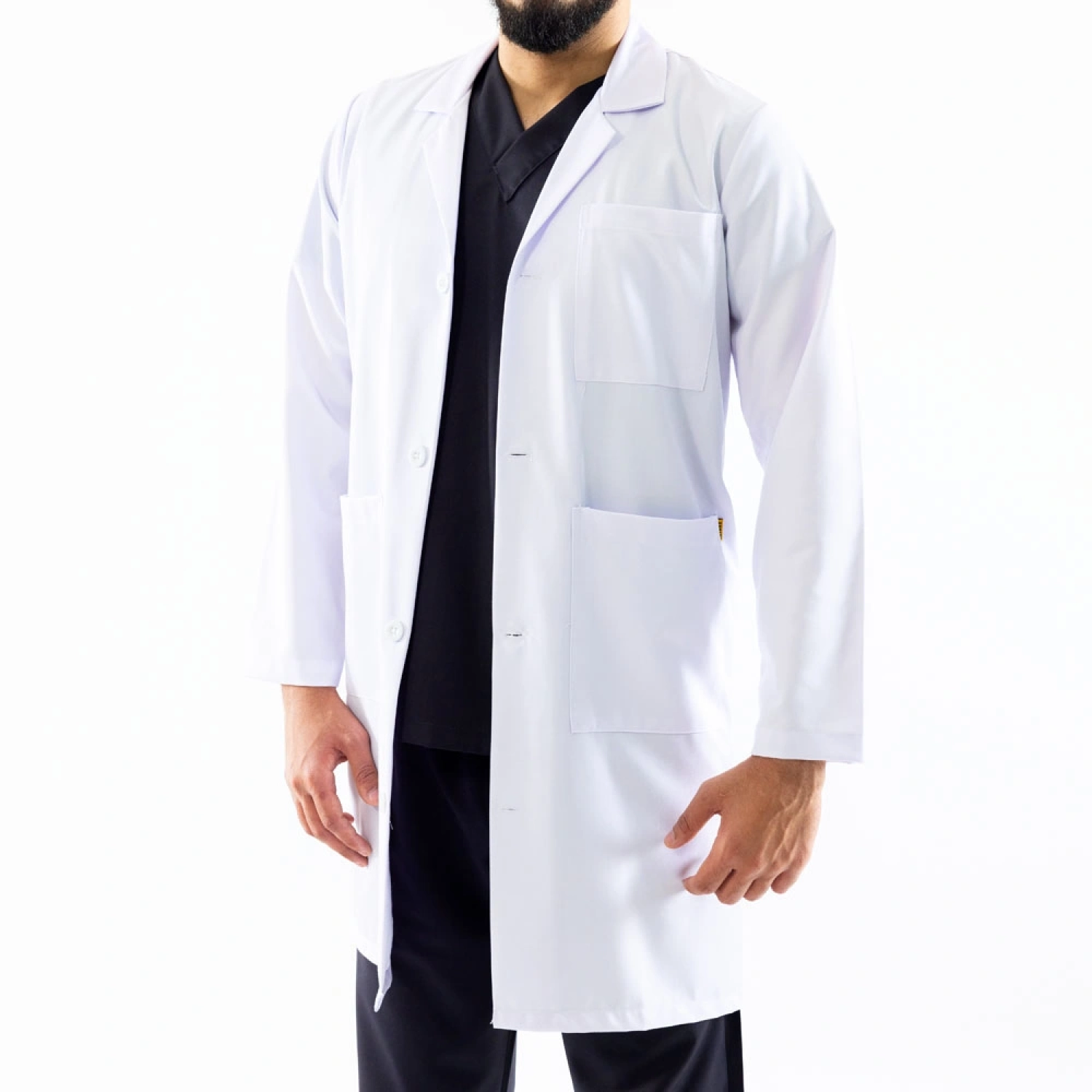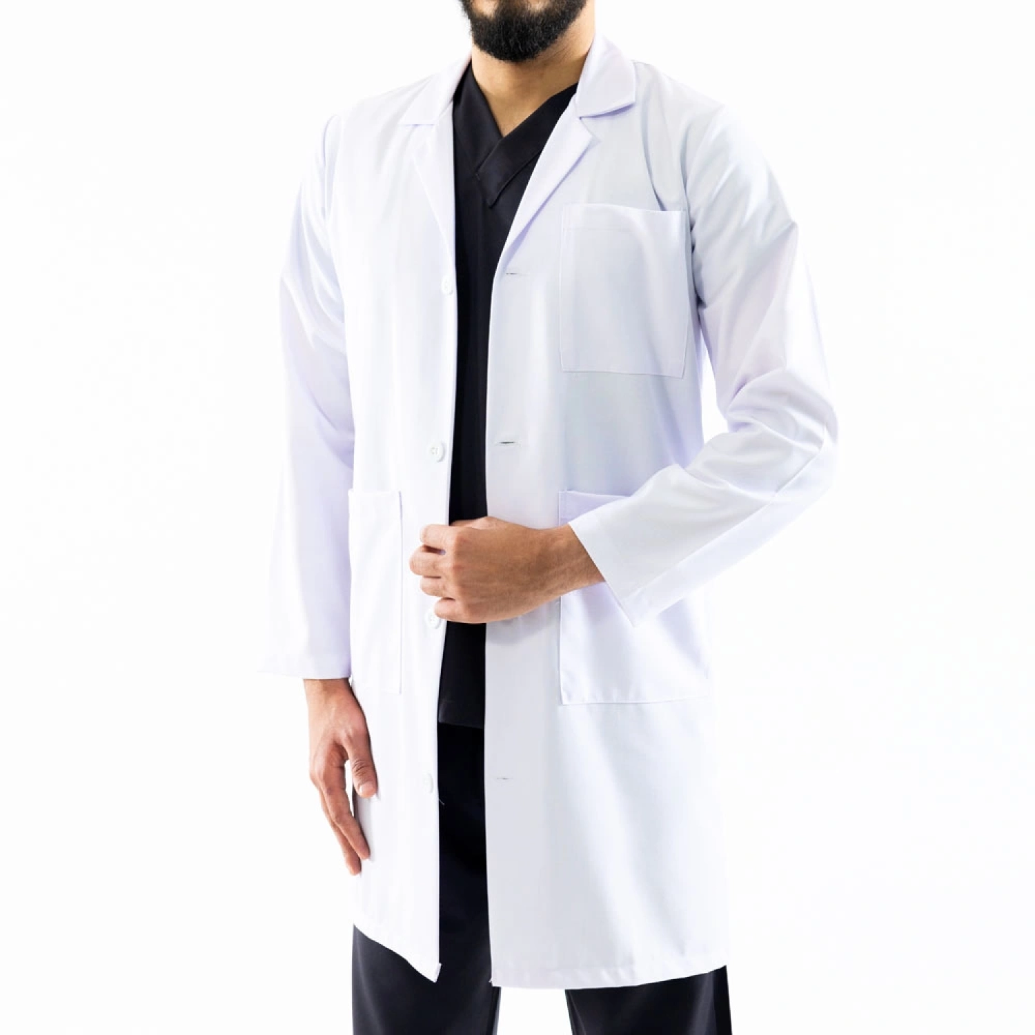Unisex white lab coat, made from durable and lightweight fabric for long-lasting comfort during extended work hours. Designed with a sleek, long-sleeve cut and front button closure for a professional appearance. Features multiple functional pockets for convenient storage of essential tools. The breathable fabric enhances all-day comfort, making it an ideal choice for doctors, nurses, and healthcare professionals.