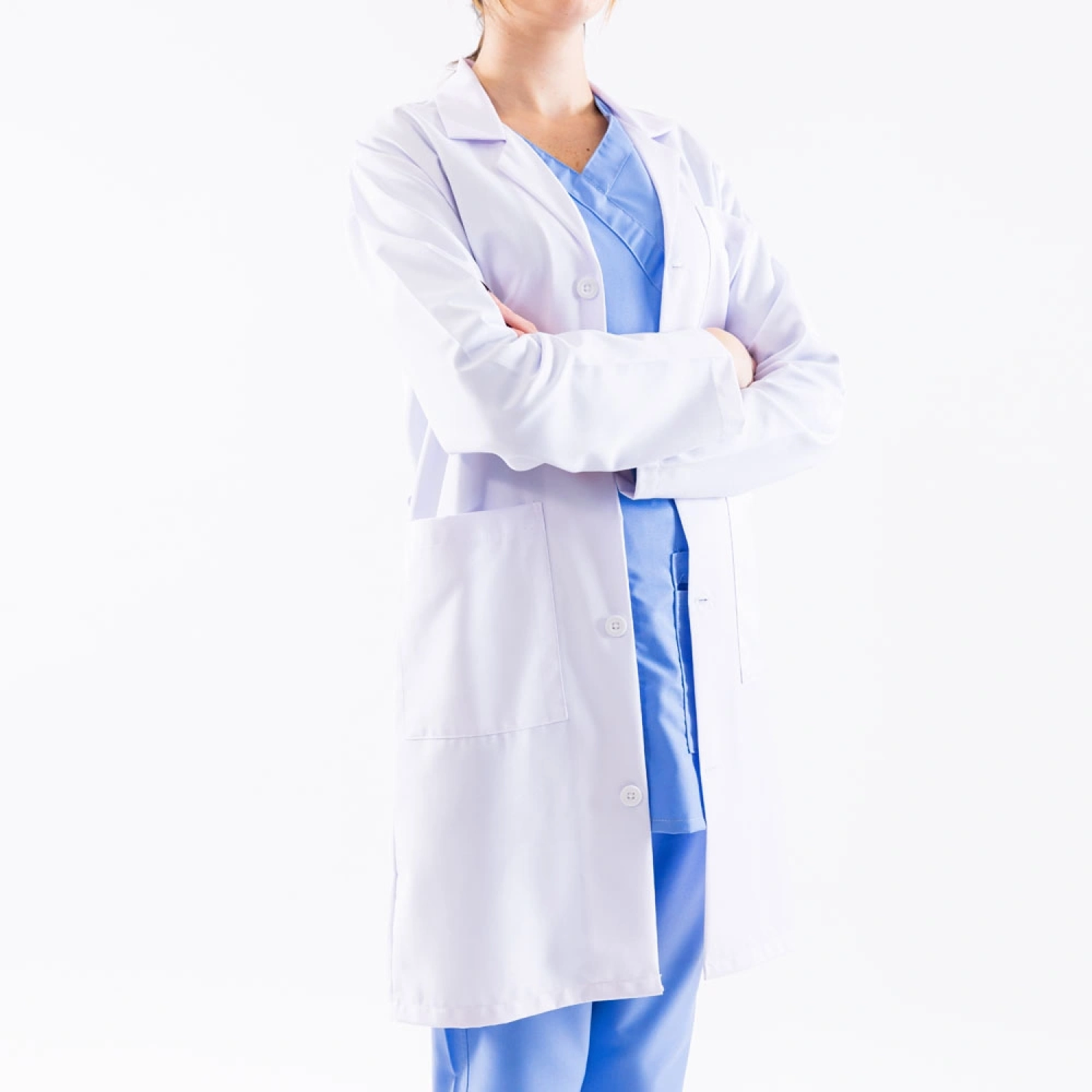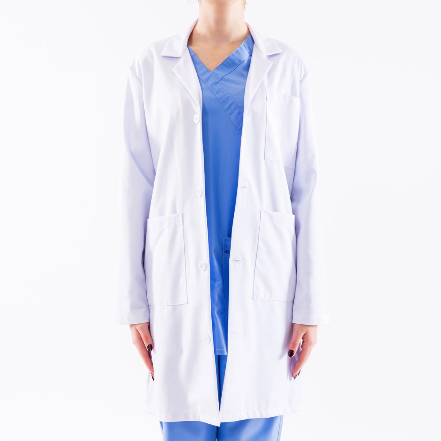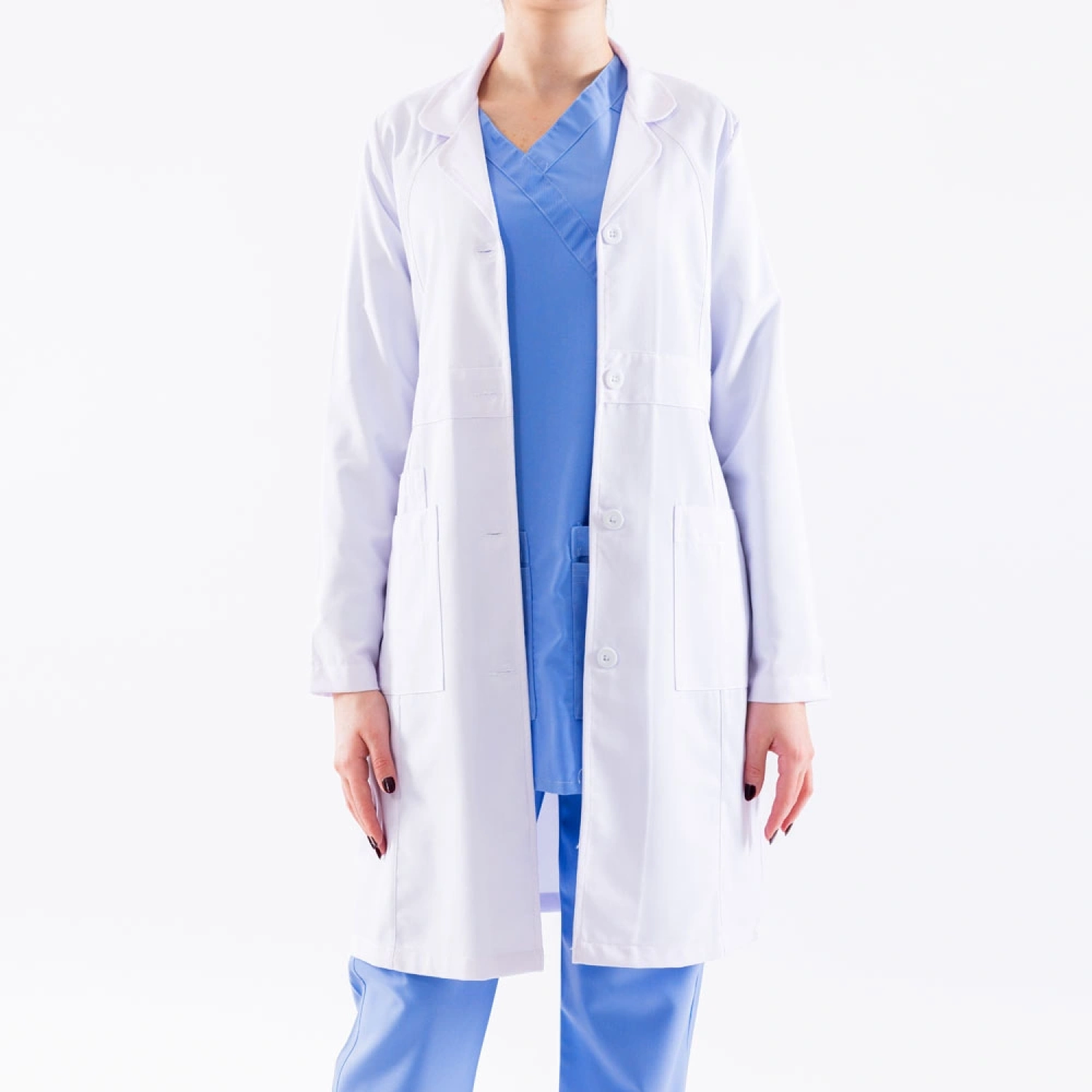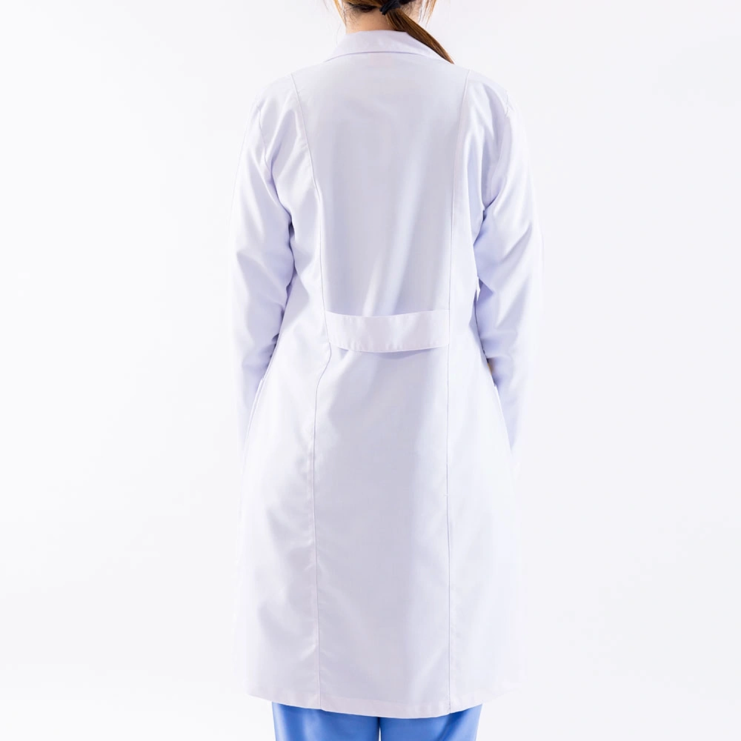 Women's White Lab Coat, made from durable and lightweight fabric for all-day comfort. Designed with a sleek, long-sleeve cut and front button closure for a professional look. Features multiple functional pockets for convenient storage of essential tools. The breathable fabric enhances comfort, making it an excellent choice for female healthcare professionals.