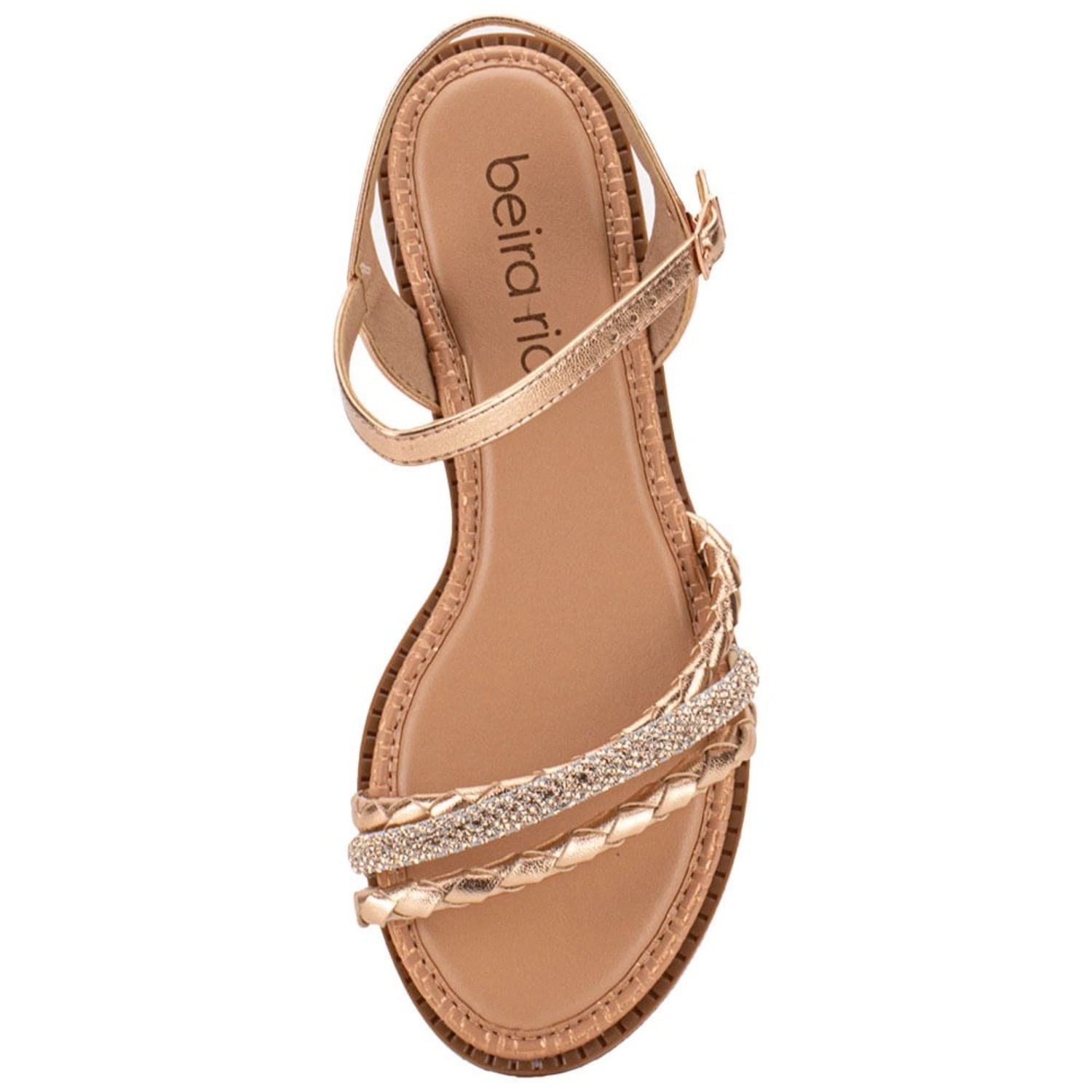 Beira Rio, a brand acclaimed for its innovative and comfortable designs since 1975, presents the Women's Sandal Flat in Rose Gold. These exquisite sandals are crafted from high-quality Eco Leather, Napa Turim, adorned with braided straps and sparkling rhinestone embellishments that add a luxurious touch. The elegant rose gold color enhances their sophisticated appeal, making them perfect for both daytime and evening wear. Featuring a comfortable EVA insole and a durable rubber sole, these flats offer excellent stability and support, ideal for all-day wear. With their flat heel and refined aesthetic, these sandals embody Beira Rio's commitment to fashion-forward and practical footwear.