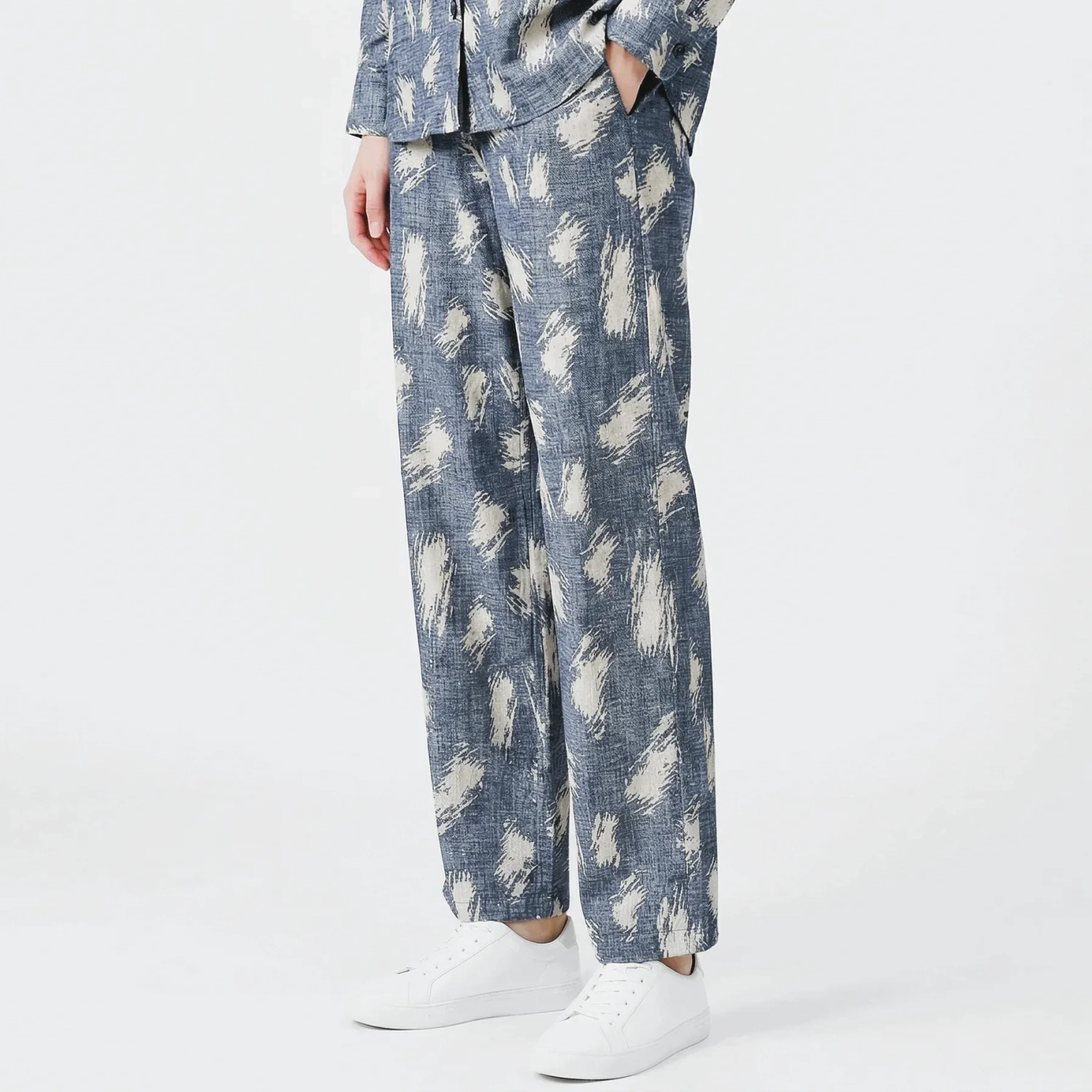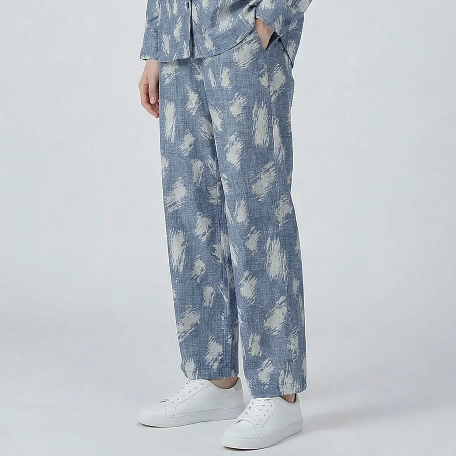 These blue pants with a stylish white printed design offer a modern and fresh look. Designed with a comfortable fit and a clean silhouette, they are perfect for everyday wear or smart-casual outfits.