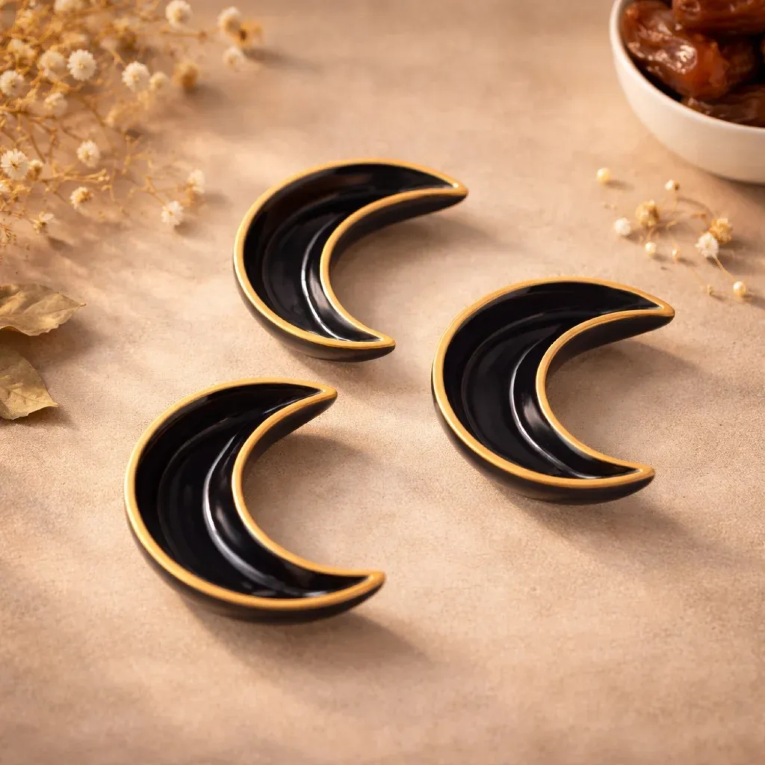 This elegant crescent-shaped ceramic tray with a glossy black interior and golden rim is perfect as both a decorative piece and a serving tray. Use it to present dates, sweets, or small bites during Ramadan gatherings, or display it as a stylish accent in your home. Its unique design adds sophistication and festive charm to any setting.