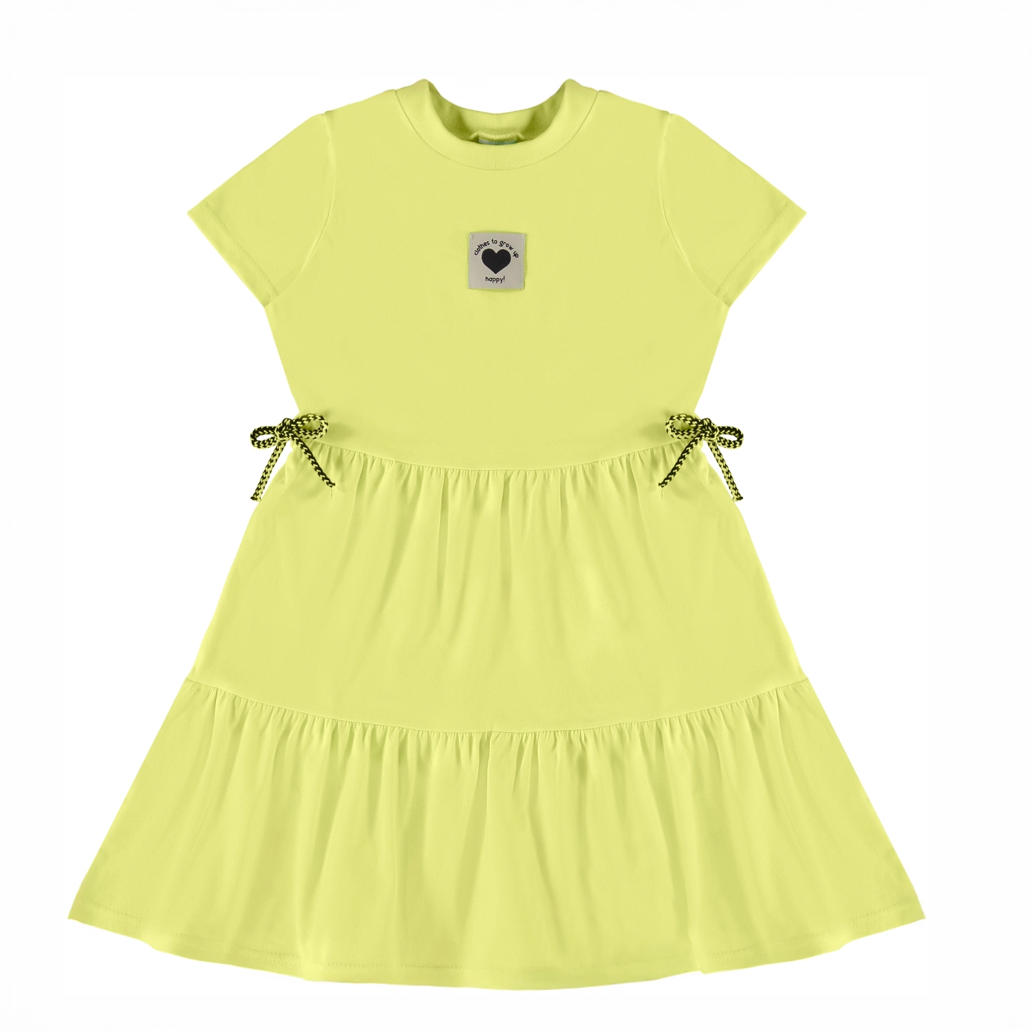 This sweet tiered dress in soft cotton knit features a round neckline, short sleeves, and decorative side bows. Finished with a delicate tag detail, it’s perfect for playful days with a charming touch.