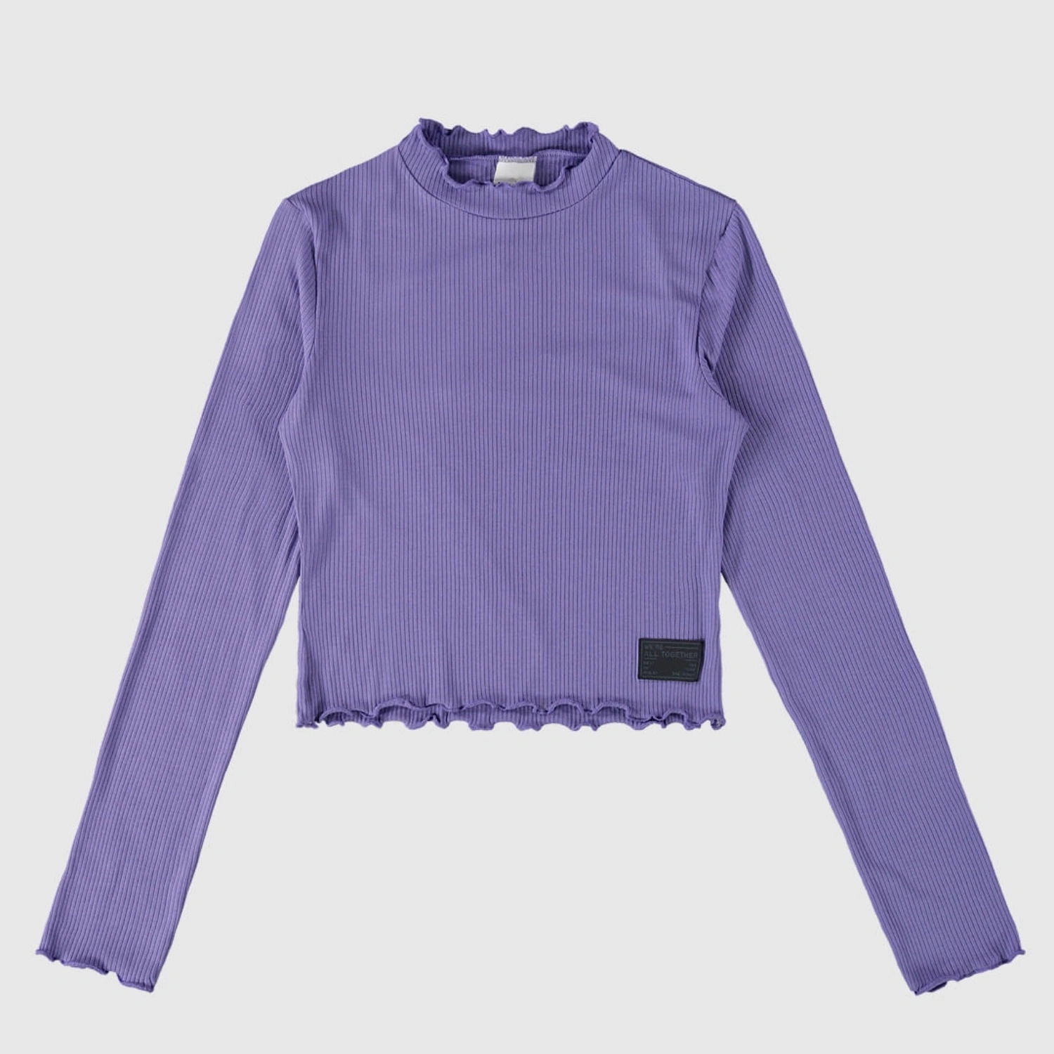 Cropped long-sleeve top for teen girls made from ribbed knit fabric, featuring a round neckline and delicate picot-edge finishing. A stylish and comfy piece for casual looks or layered outfits.