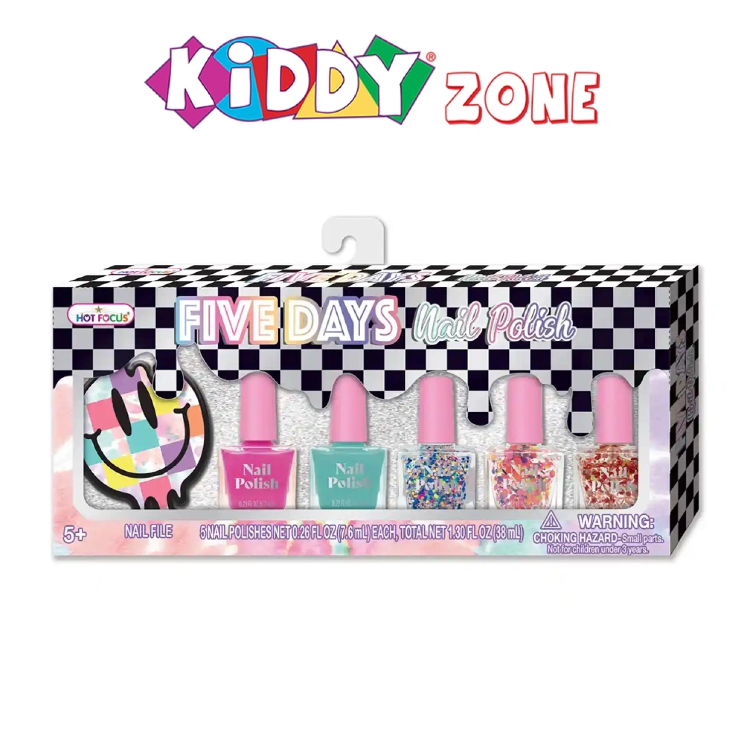 Long-lasting nail polish designed to stay vibrant for up to five days, featuring cheerful smiley-themed packaging.