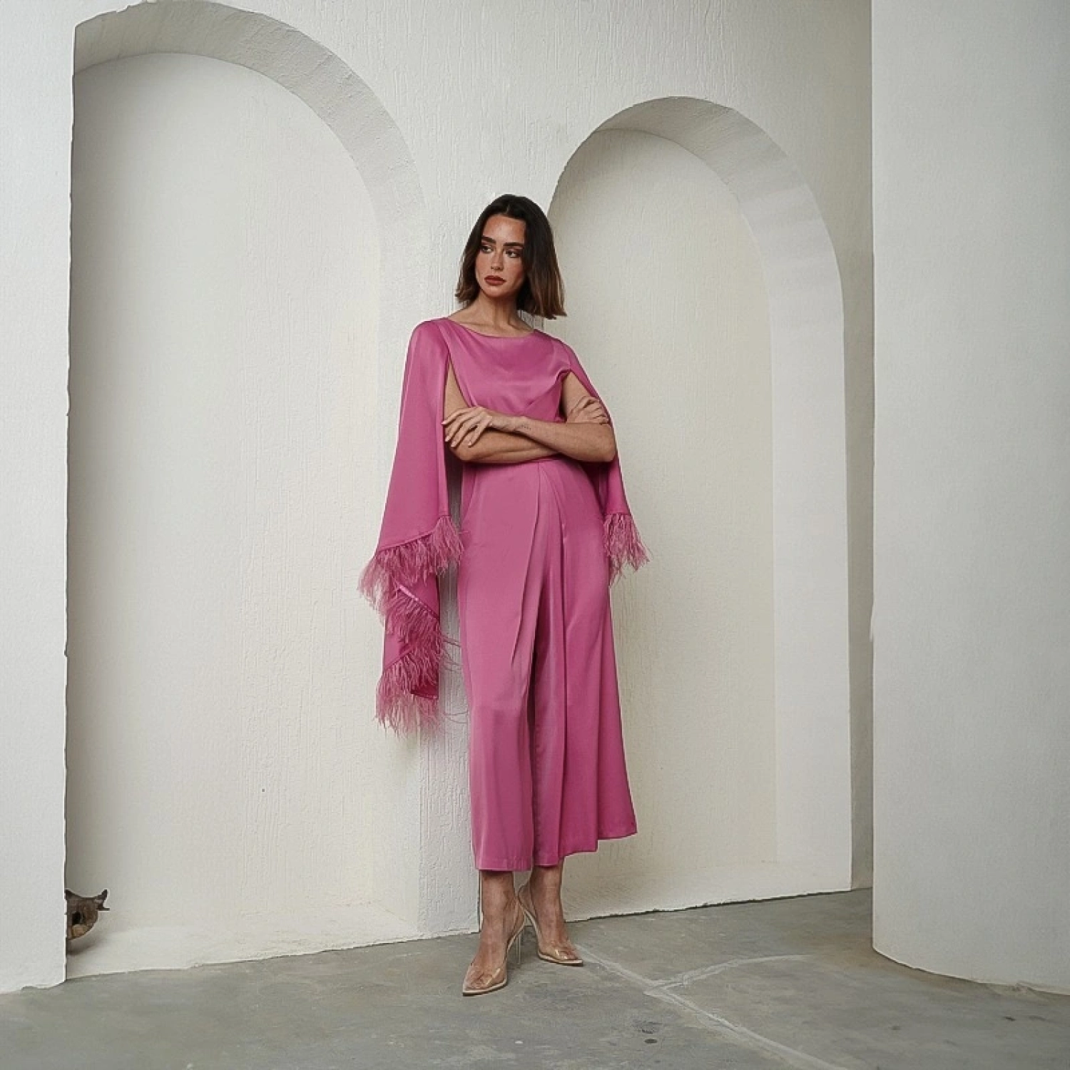 Jumpsuit with Feather Cape Sleeves - Dark Pink