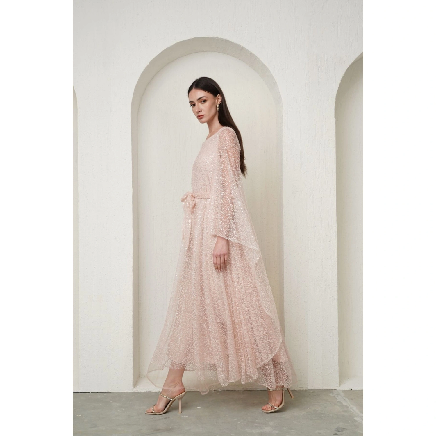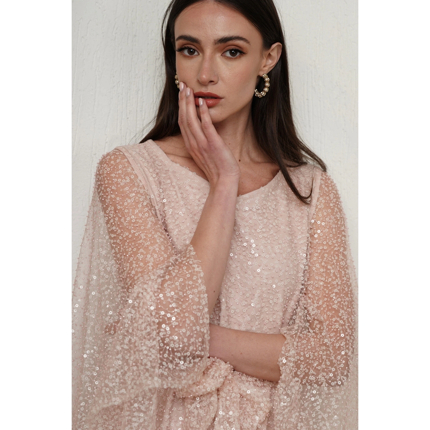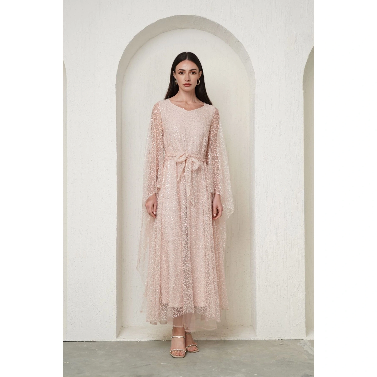 Pink embellished dress with cape sleeves, Polyester - 100%