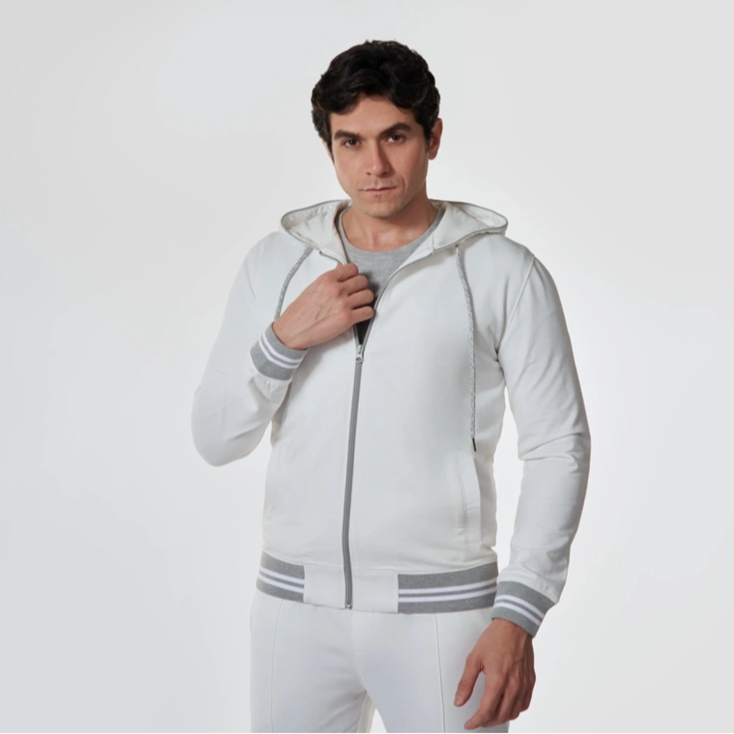 two-piece training suit, made from 100% cotton, offer a comfortable and stylish option for lounging and sleeping. The Off white color is so eye-catching, and the long cuffed sleeves add a touch of sophistication. The pants feature two side pockets and an elastic waist with an adjustable drawstring for a customized fit, making them ideal for all body shapes and sizes. Whether you're snuggled up in bed or running errands, these breathable and lightweight pajamas will keep you feeling comfortable all day long.