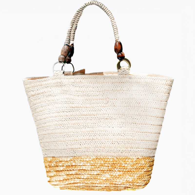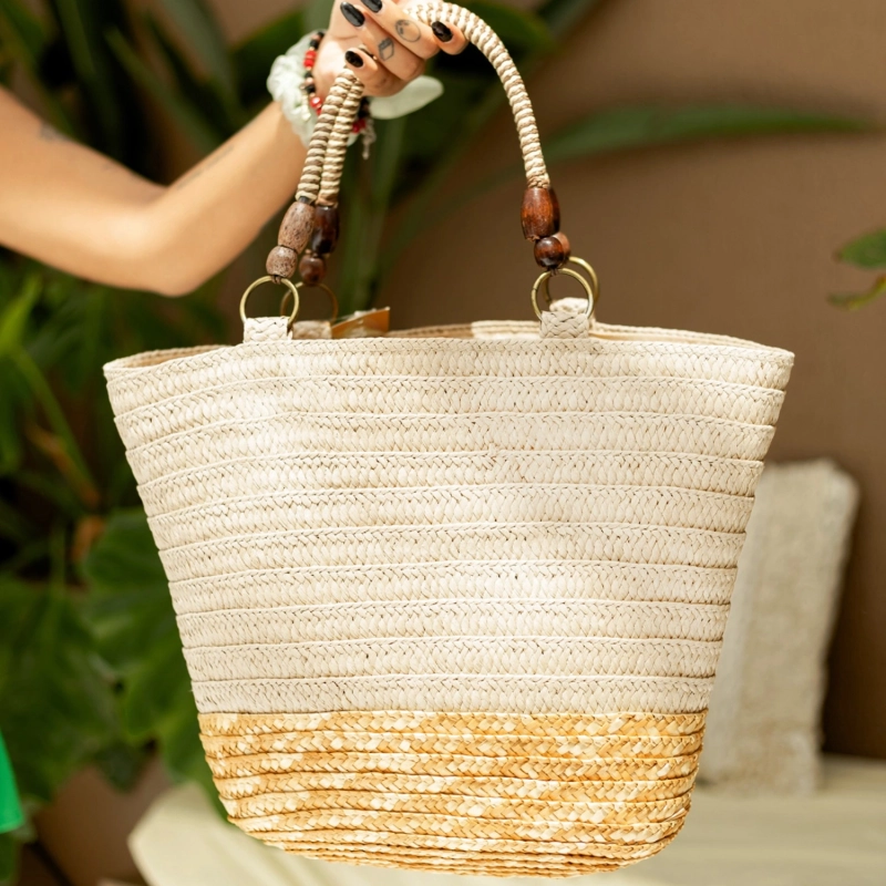 Spacious and laid-back, the Bahia Breeze Straw Tote captures the effortless charm of beachside days and sunny escapes. Designed with a roomy silhouette, it features a two-tone woven straw body that adds texture and contrast. The rounded handles wrapped in thread and finished with wooden bead accents bring a natural, artisanal touch. Available in Ivory Dune and Golden Sand, this tote offers plenty of space for your essentials, making it perfect for seaside strolls, market runs, or stylish getaways. Sized at 45 × 32 cm.