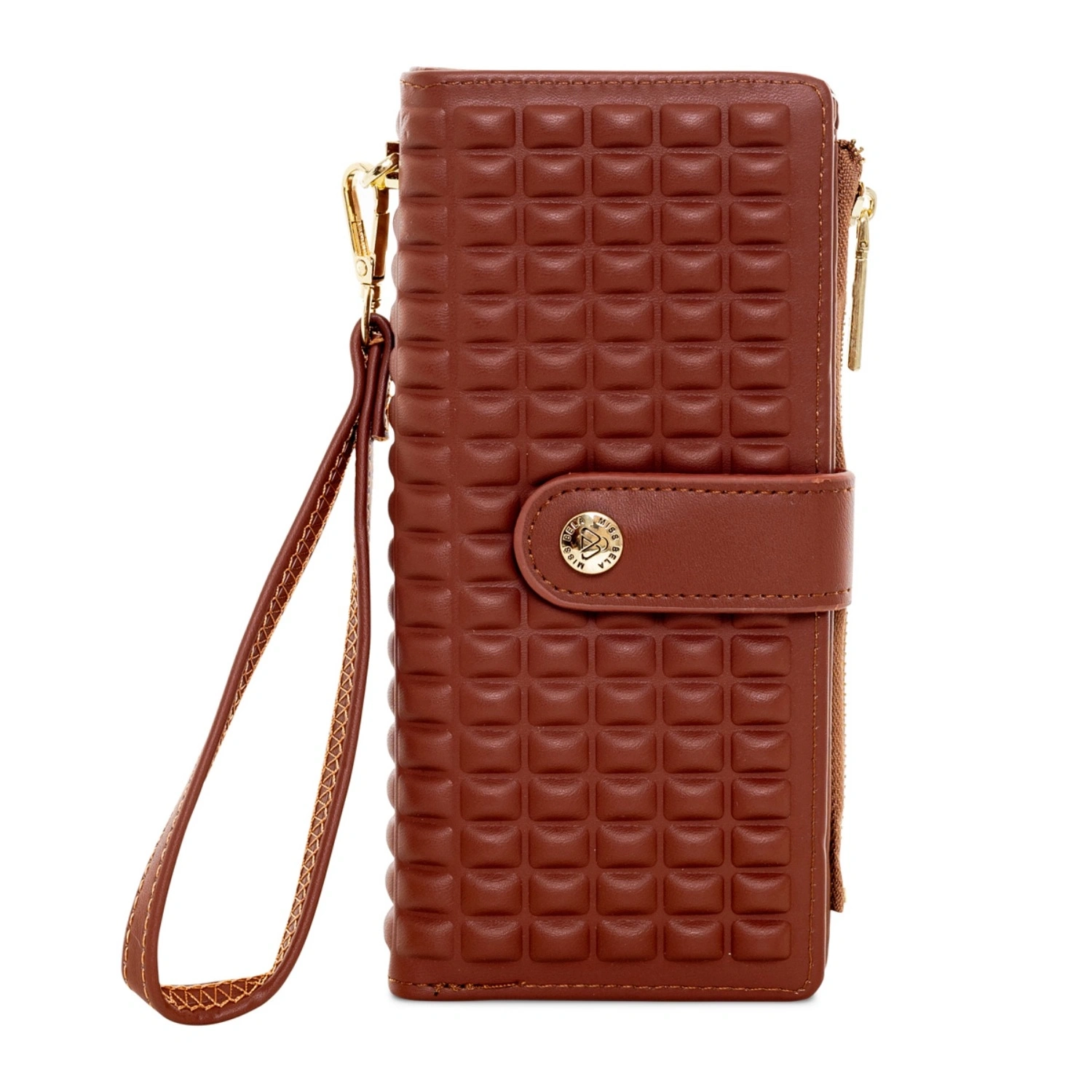 The Lunari Wallet stands out with its molded polyurethane body, giving it a modern, structured silhouette with a soft-touch feel and water-resistant finish. The bold quilted texture and gold-tone accents offer both fashion and function, while the detachable wristlet adds everyday ease. Sized at 19x9 cm, it comes in Ivory White, Cedar Brown, and Forest Green.