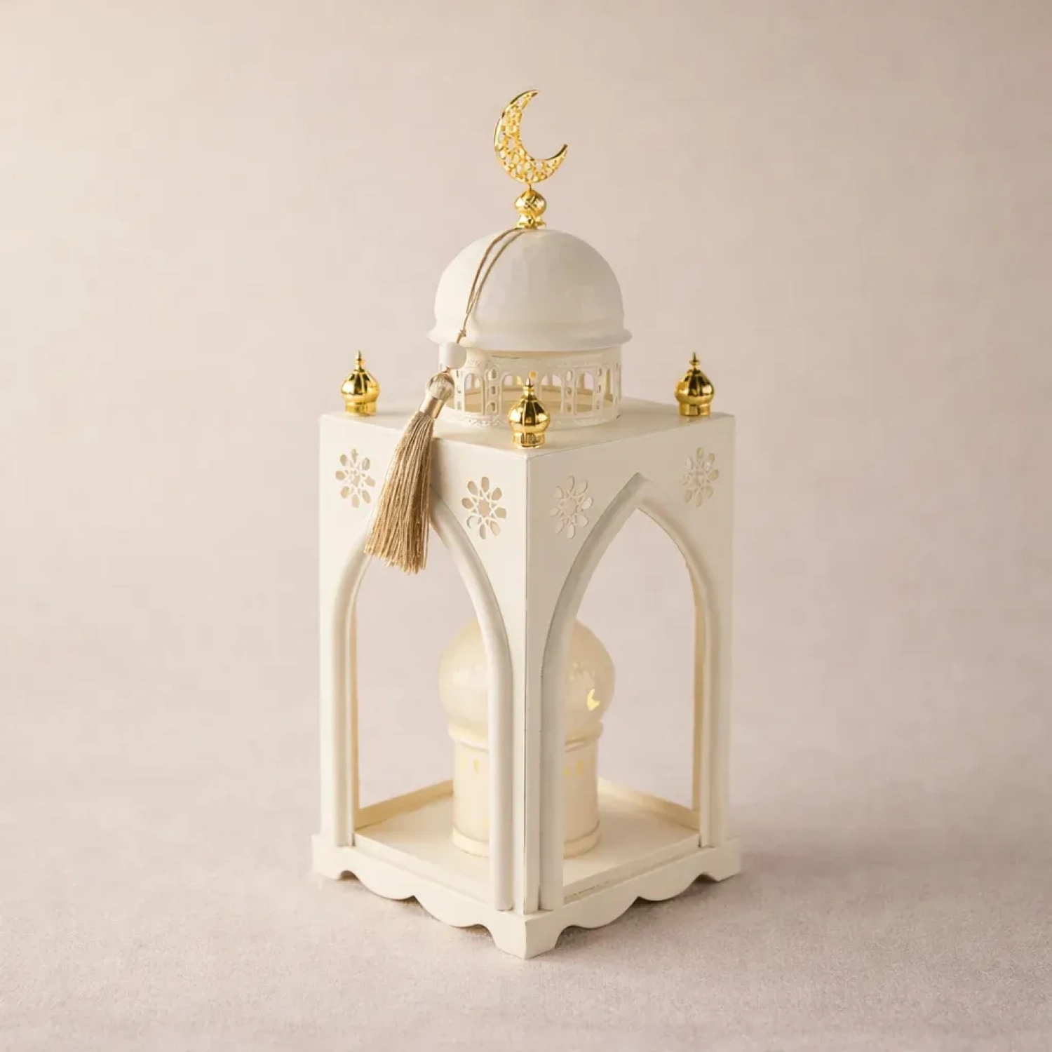 Add a serene touch to your Ramadan décor with this elegant white metal lantern. Designed with a mosque-inspired arch, delicate cut-out details, and crescent moon accents, this decorative piece creates a calm and inviting atmosphere. The soft white finish enhances its timeless appeal, making it a perfect addition to any space. Display it on a side table, console, or as a centerpiece to elevate your festive décor.