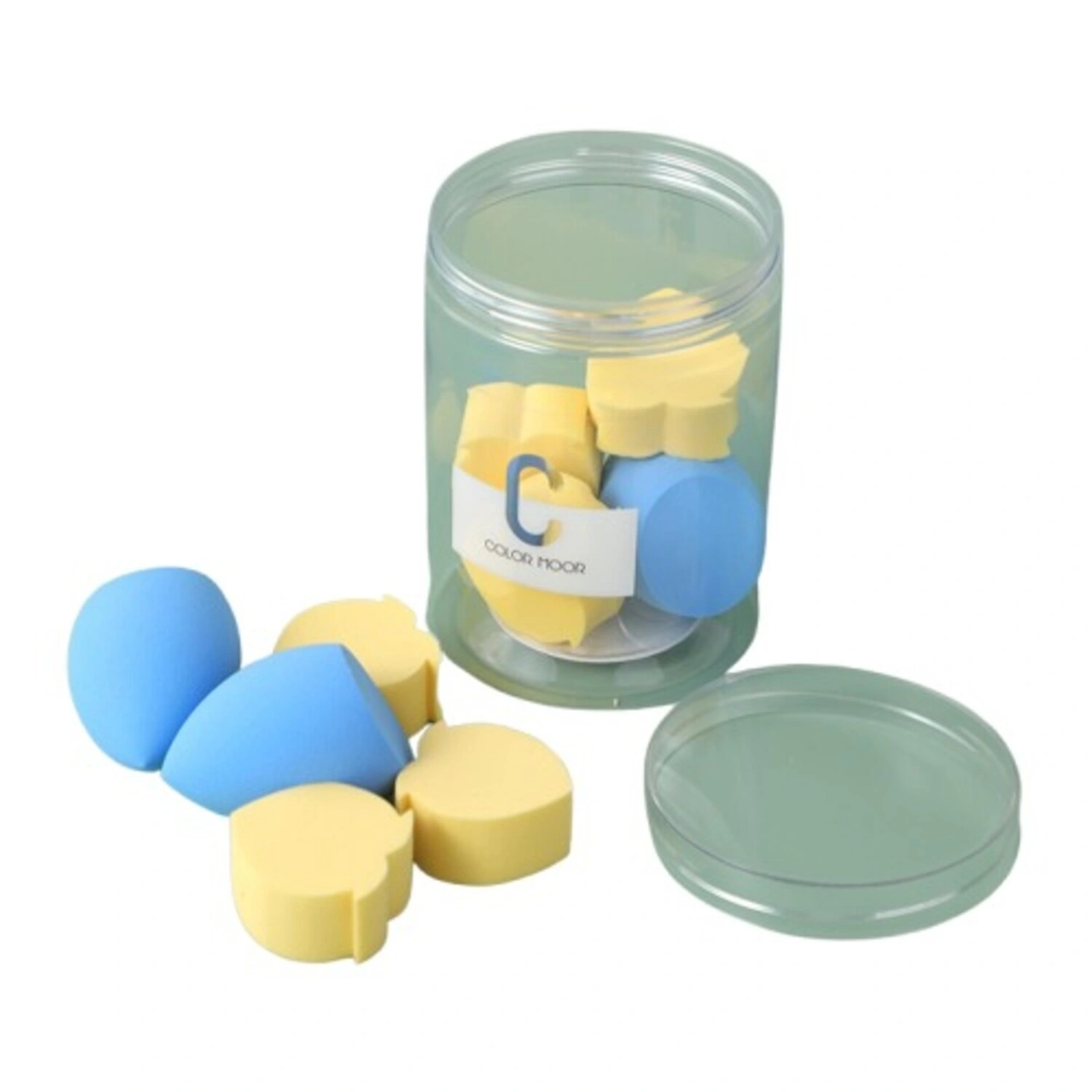 A set of 9 soft and delicate powder puffs with a barreled design. Ideal for applying makeup, powder, or skincare products evenly. Comes in blue and yellow colors, suitable for everyday beauty routines.