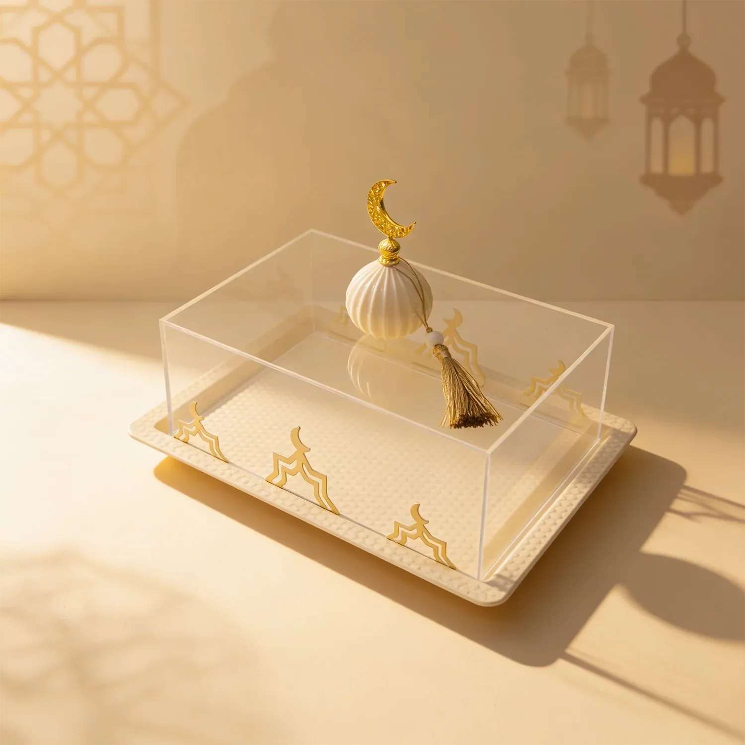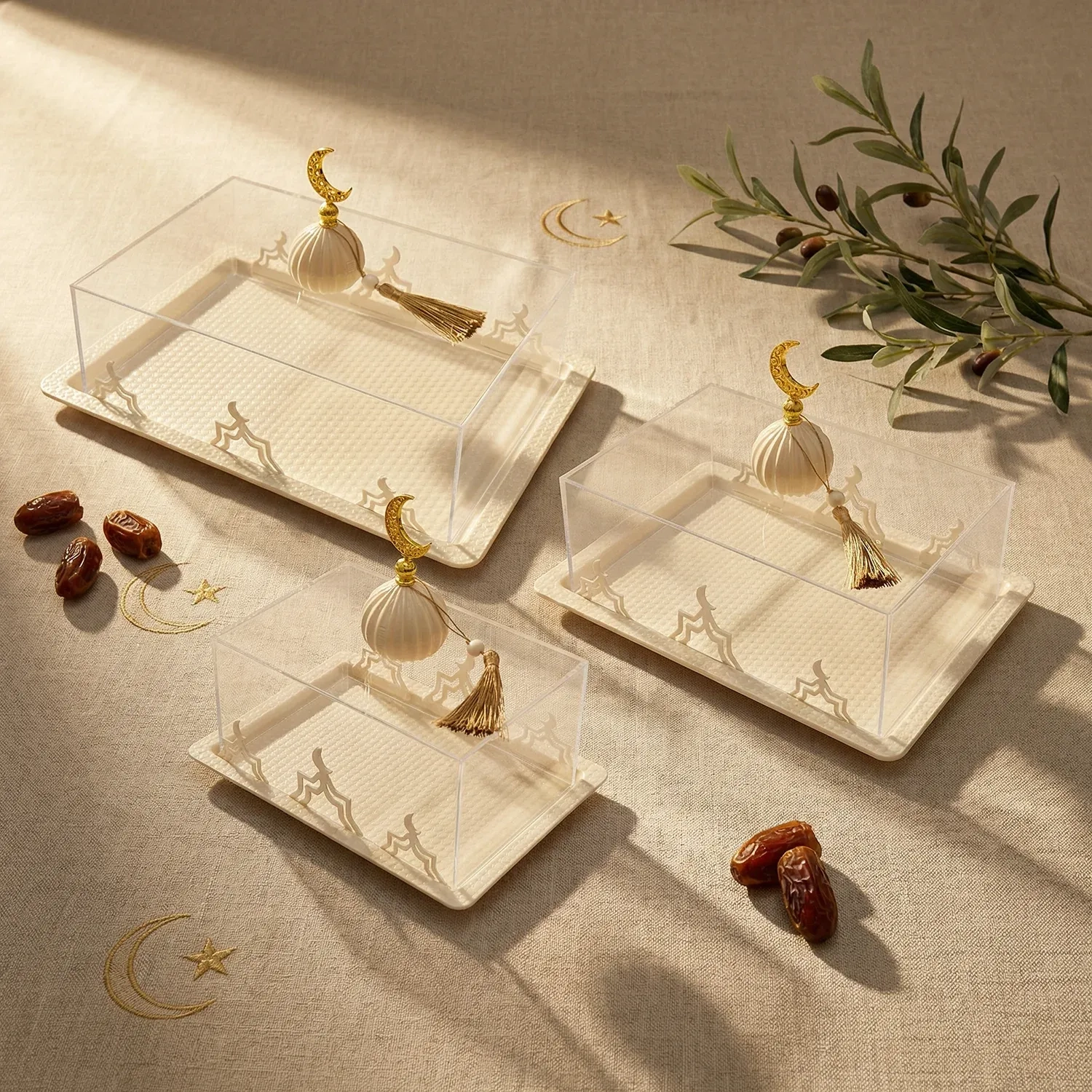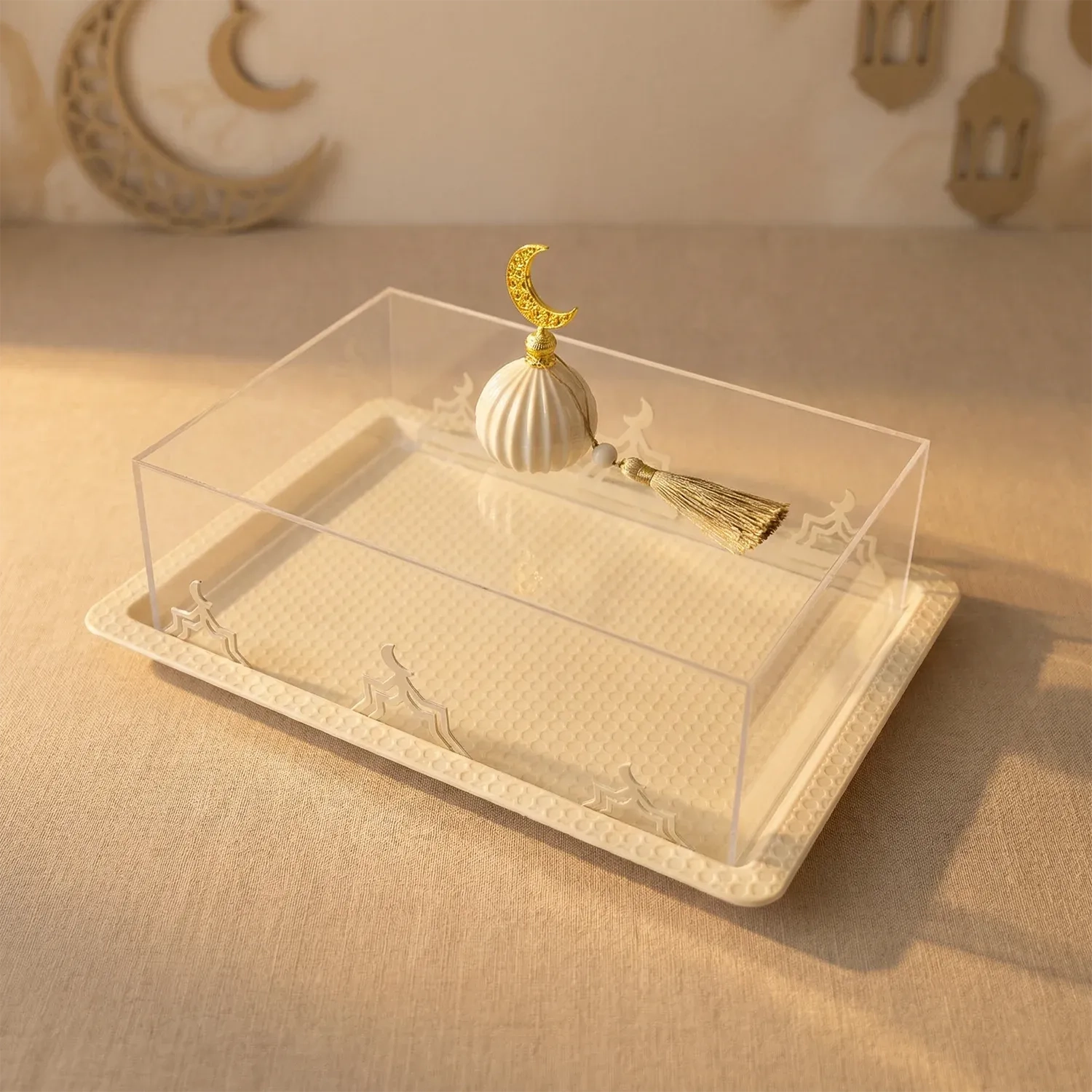 Serve your guests in style with this elegant transparent tray set, specially designed for Ramadan gatherings. Its refined design makes it perfect for presenting small bites, sweets, or dates, while adding a festive touch to your table. Lightweight yet durable, these trays are ideal for family iftar or suhoor, creating a warm and welcoming atmosphere.