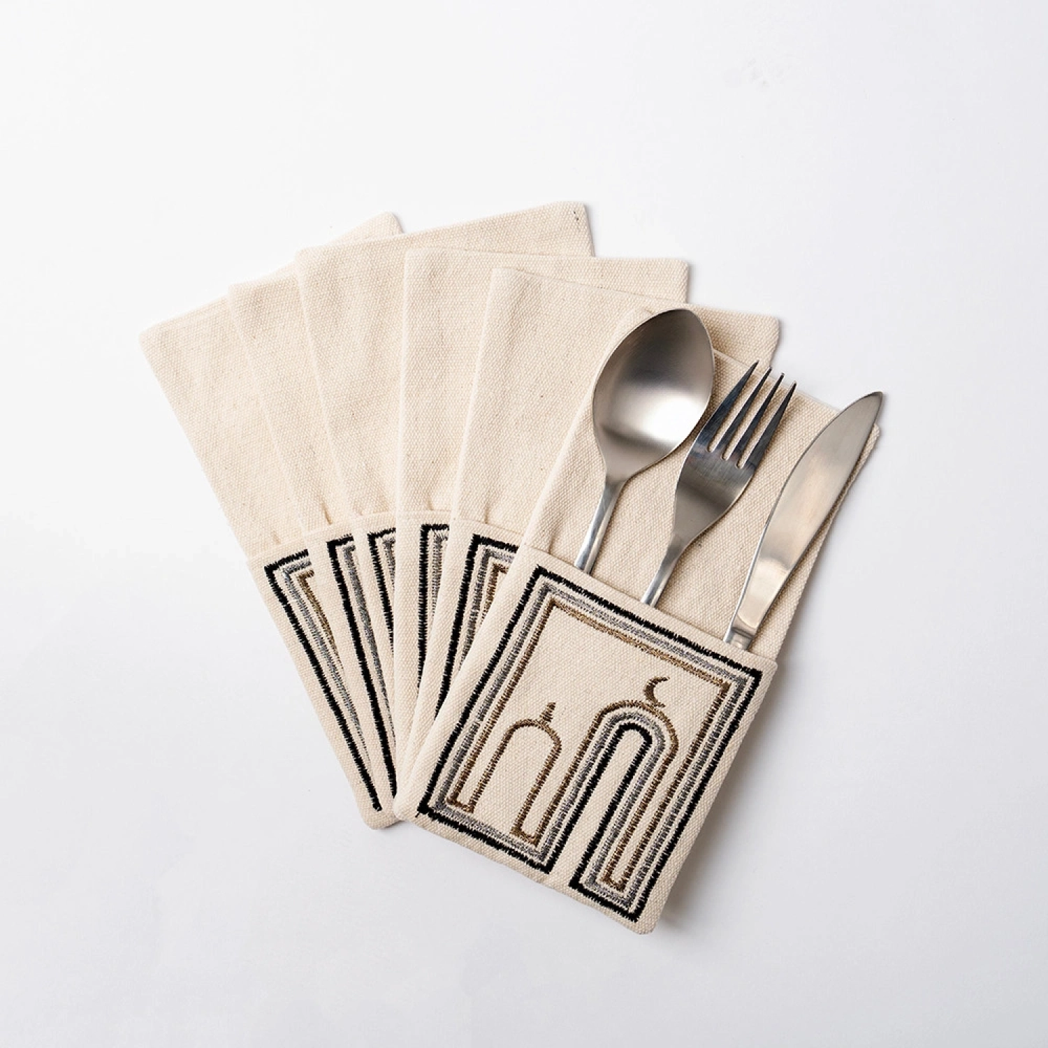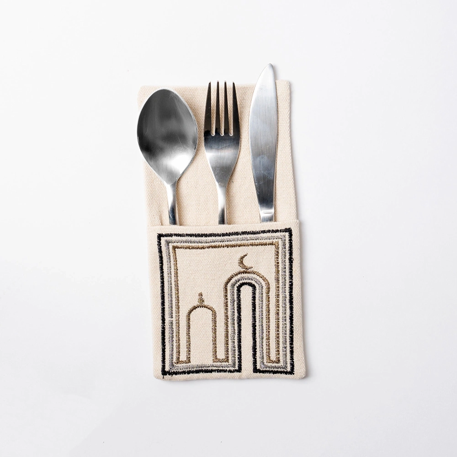 Add a touch of elegance and cultural charm to your dining table with this beautifully crafted Set of Embroidered Cutlery Covers. Inspired by Islamic architectural patterns and the symbolic Ramadan crescent, these covers enhance table settings during Ramadan, Eid, and special gatherings, creating a warm and festive atmosphere.