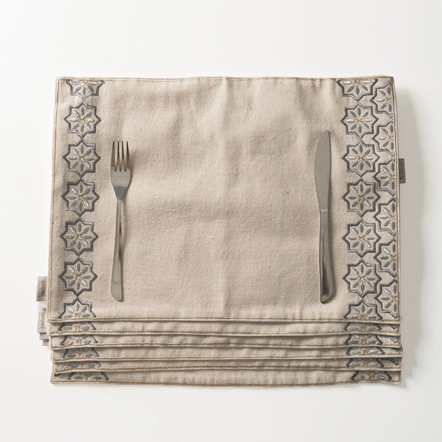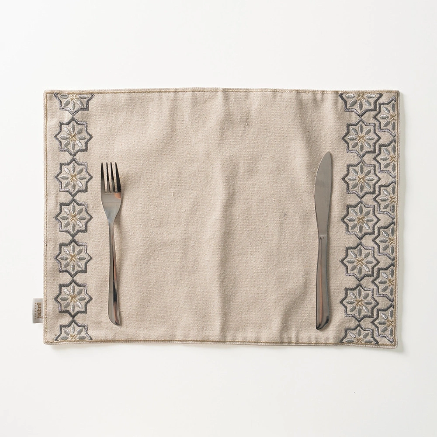 A sophisticated placemat featuring Islamic-inspired embroidery with elegant geometric patterns on both sides. It adds a touch of luxury to your dining table, crafted from high-quality materials for durability and easy maintenance, making it perfect for both everyday use and special occasions.
