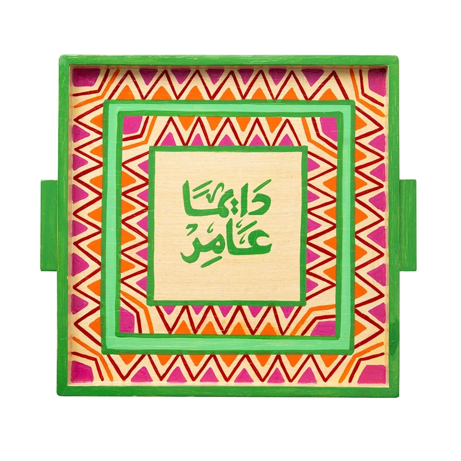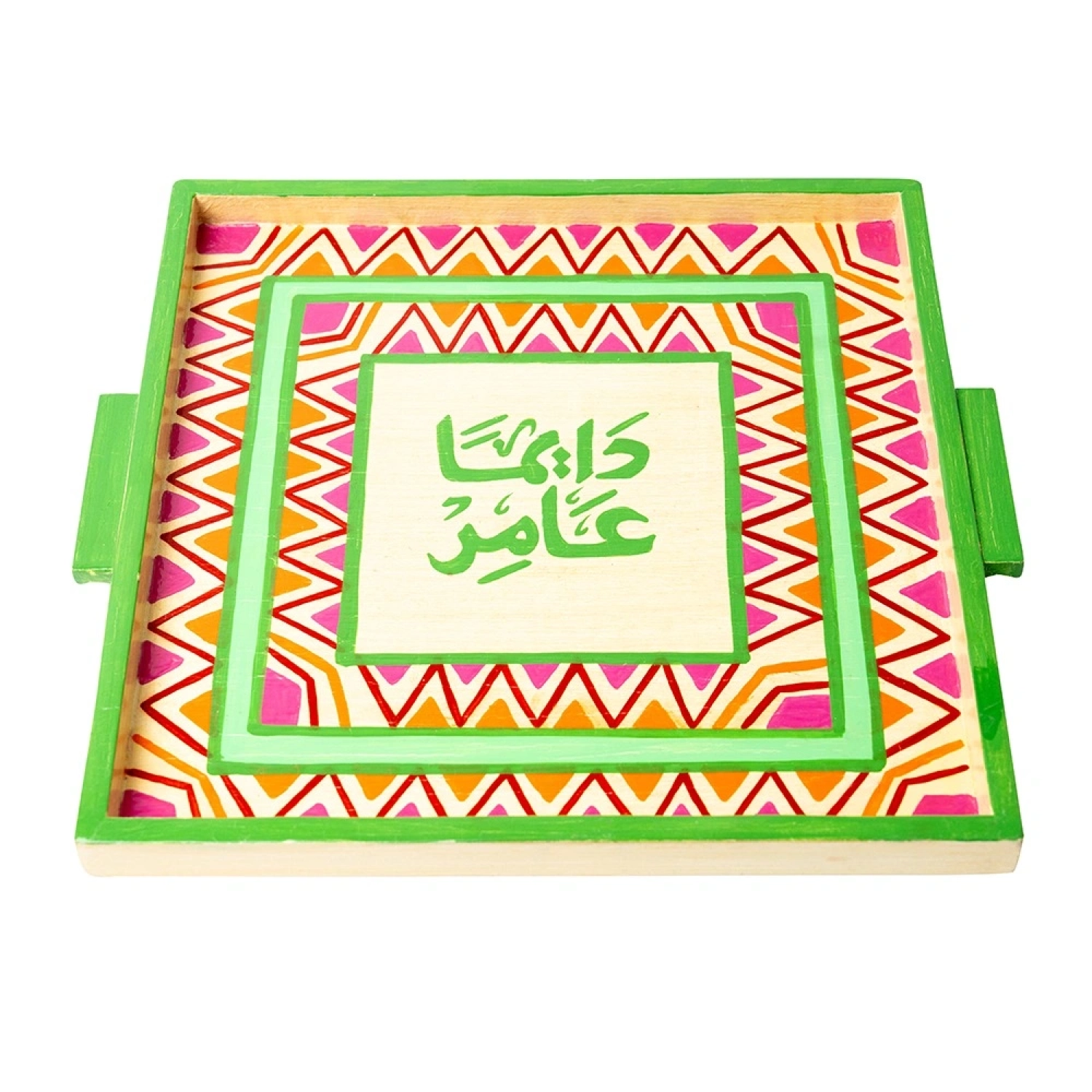 Serve your guests in style with this unique handcrafted wooden plate, featuring vibrant colors and traditional patterns inspired by heritage art. The inscription "Daiman Amer” symbolizes abundance and generosity, making it perfect for serving drinks and sweets on special occasions or as a stunning decorative piece in your home.