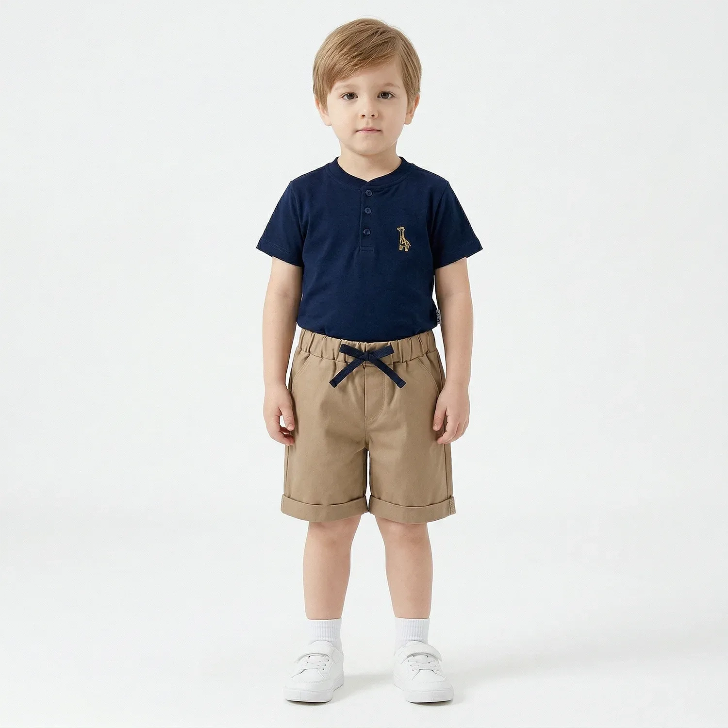 From Tip Top, the iconic Brazilian children’s brand since 1952, comes this adventurous "Little Dino" two-piece set. Renowned for its legacy of high-quality craftsmanship, Tip Top has designed this outfit to balance a sharp, coordinated look with the rugged comfort needed for active play. The navy blue T-shirt features a playful dinosaur graphic, perfectly paired with durable khaki shorts. Crafted from a premium cotton-rich blend, this set is exceptionally breathable and soft, ensuring your little explorer stays cool and comfortable during outdoor adventures, park visits, or casual family gatherings.
