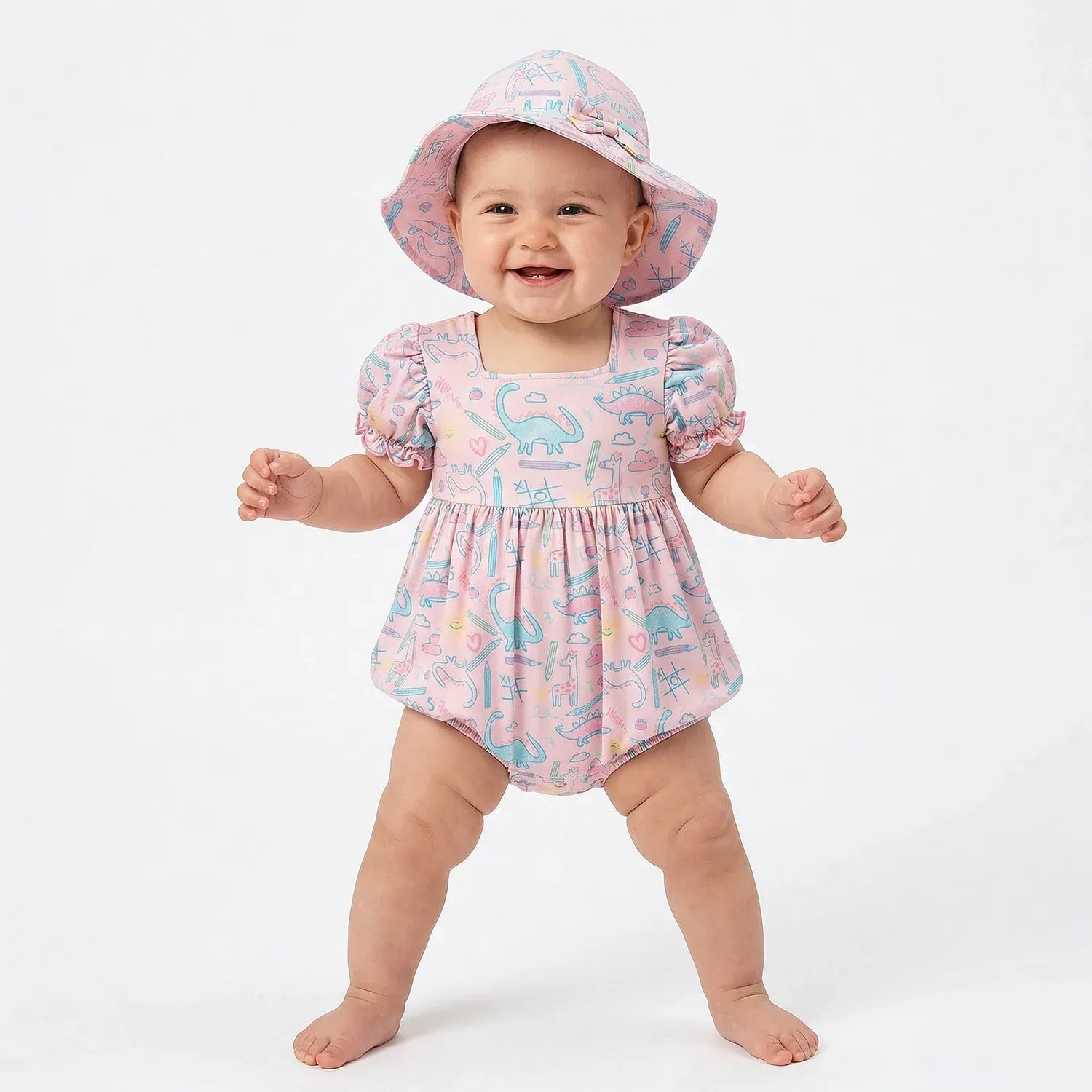 Details: Matching hat included, short sleeves, soft-stretch finish, bottom snap closures for easy changes