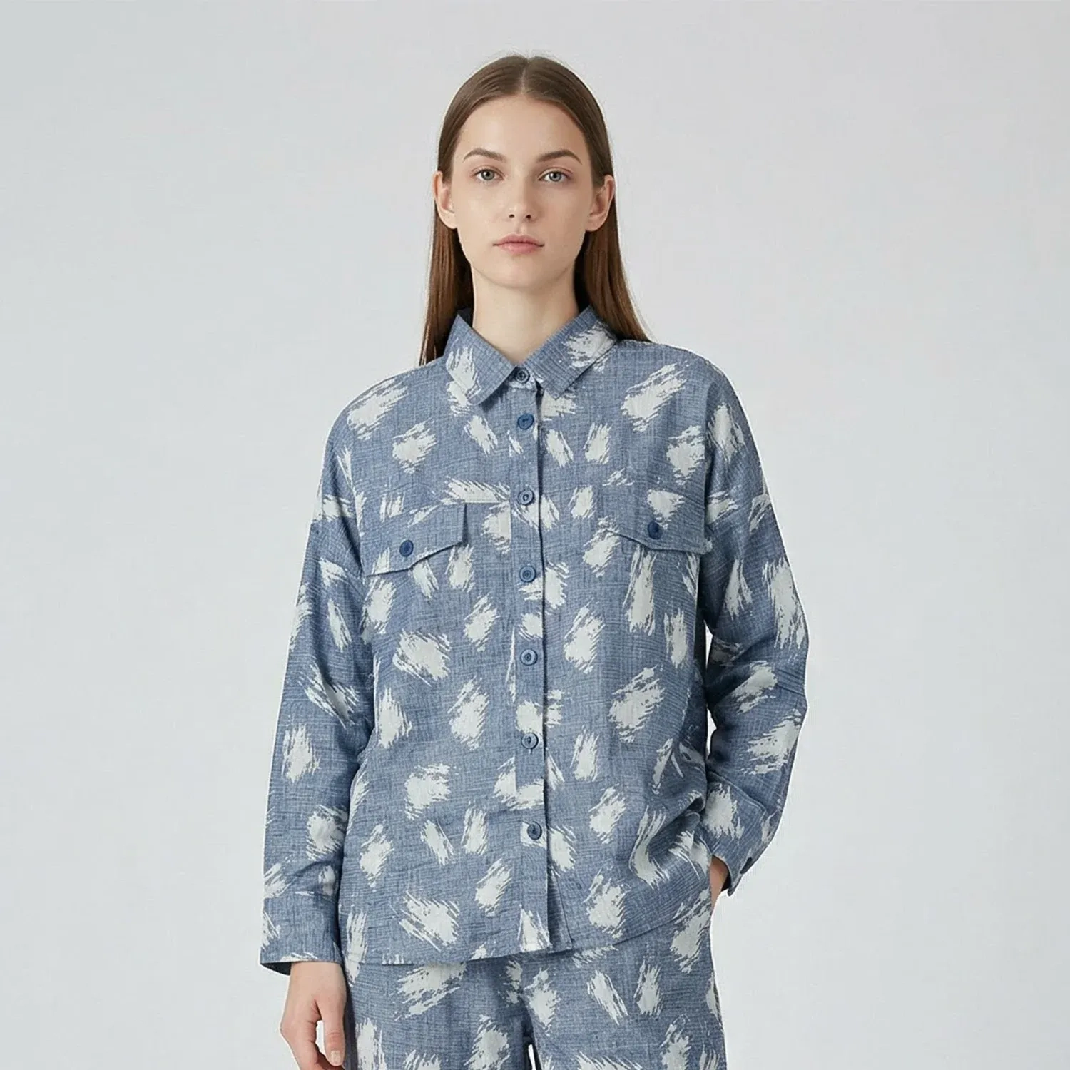 This trendy women’s shirt in blue with a white printed design adds a fresh and modern touch to your everyday look. The elegant pattern combined with a comfortable fit makes it perfect for casual and smart-casual outfits.