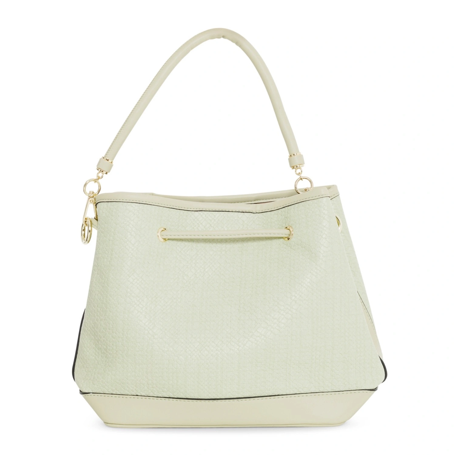 Fresh and effortlessly modern, the Lime Bloom Bucket Bag blends soft pastel green tones with the clean lines of a structured silhouette. Made from high-quality eco leather with a textured finish, it includes a drawstring top and sturdy strap for comfortable wear. A breezy touch to elevate your outfit. Sized at 32 × 22.5 cm.