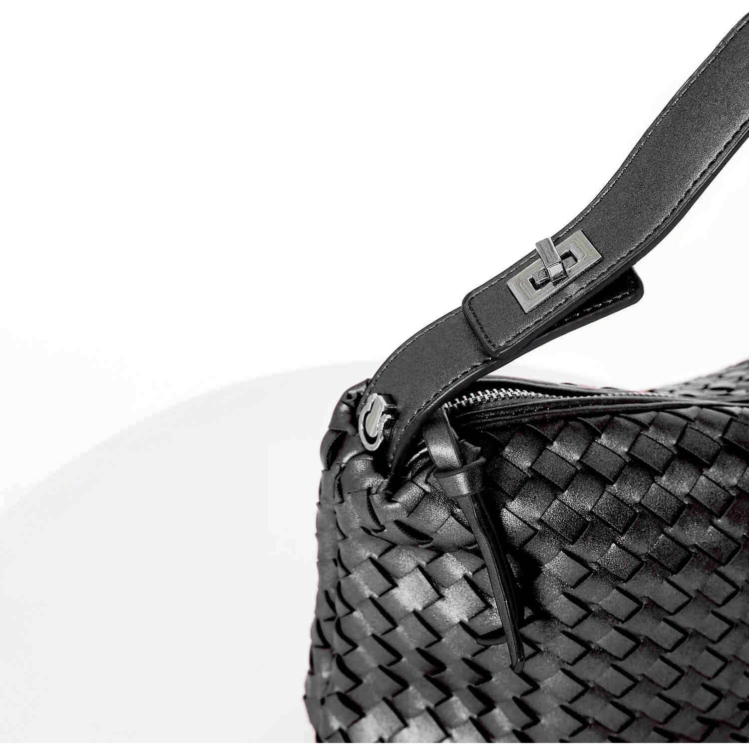 The Rivah Braided Women's Bag is a standout piece crafted in eco leather with a beautiful braided texture that brings dimension and elegance to its structured silhouette. Designed for both hand and crossbody wear, it features a soft curve, secure zip closure, and a removable strap for added versatility. Compact yet roomy, it effortlessly balances practicality and style, ideal for everything from everyday errands to evening dinners. Available in Obsidian Black, Burgundy and Golden Sand. Size: 20x30x10 cm.